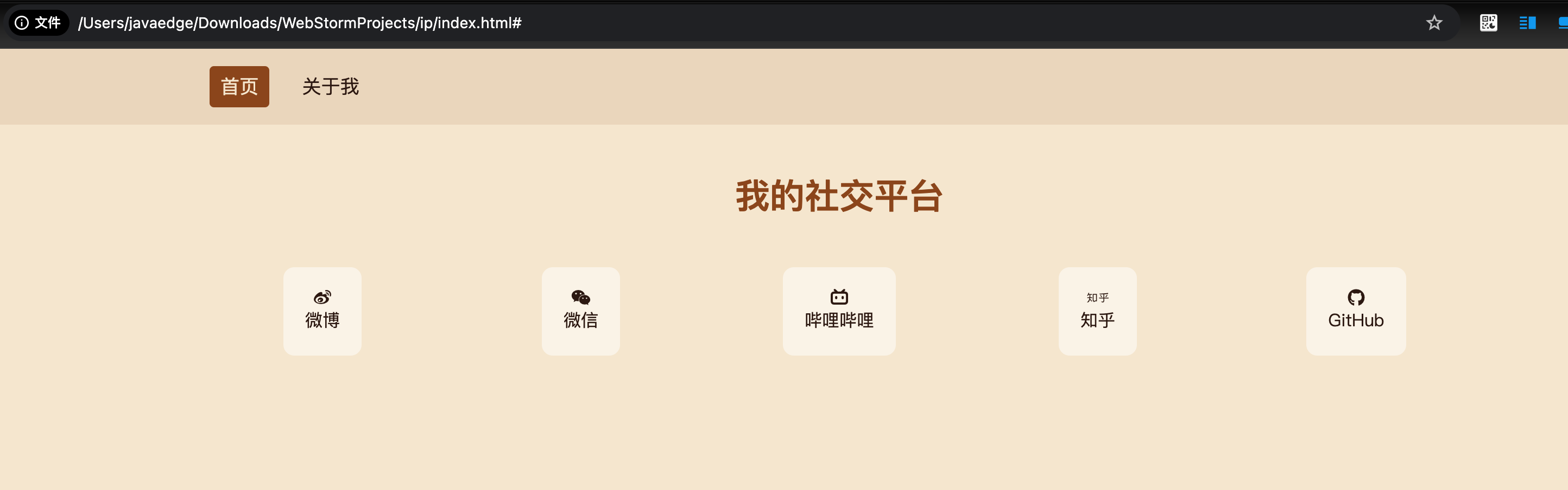 请你生成一个独立IP展示网站,包含两个页面,首页显示我所有的自媒体社交平台,about 页面显示我的个人背景介绍。网站主题色使用羊皮纸黄色,要求兼容手机端访问。