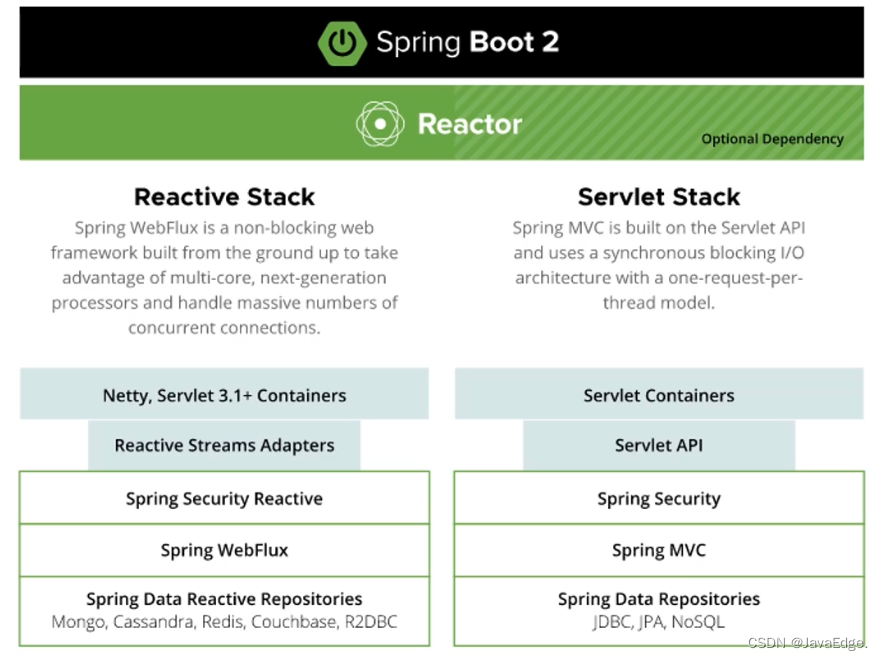 Spring 5也针对响应式编程,构建了全栈式的开发组件,提供: