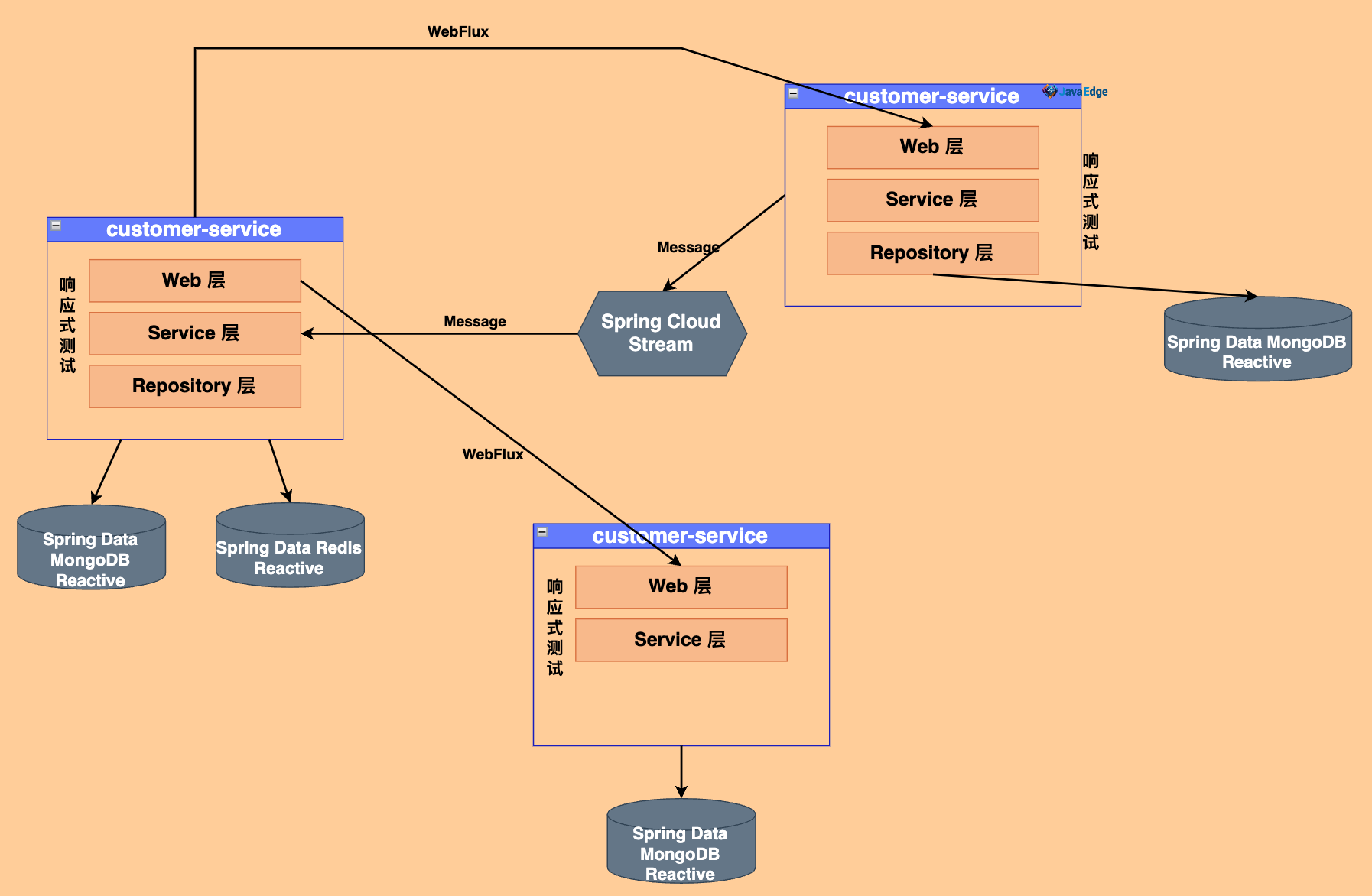 使用 Spring WebFlux 组件来分别为系统中的三个服务构建响应式 RESTful 端点,并通过支持响应式请求的 Webclient 客户端组件来消费这些端点。