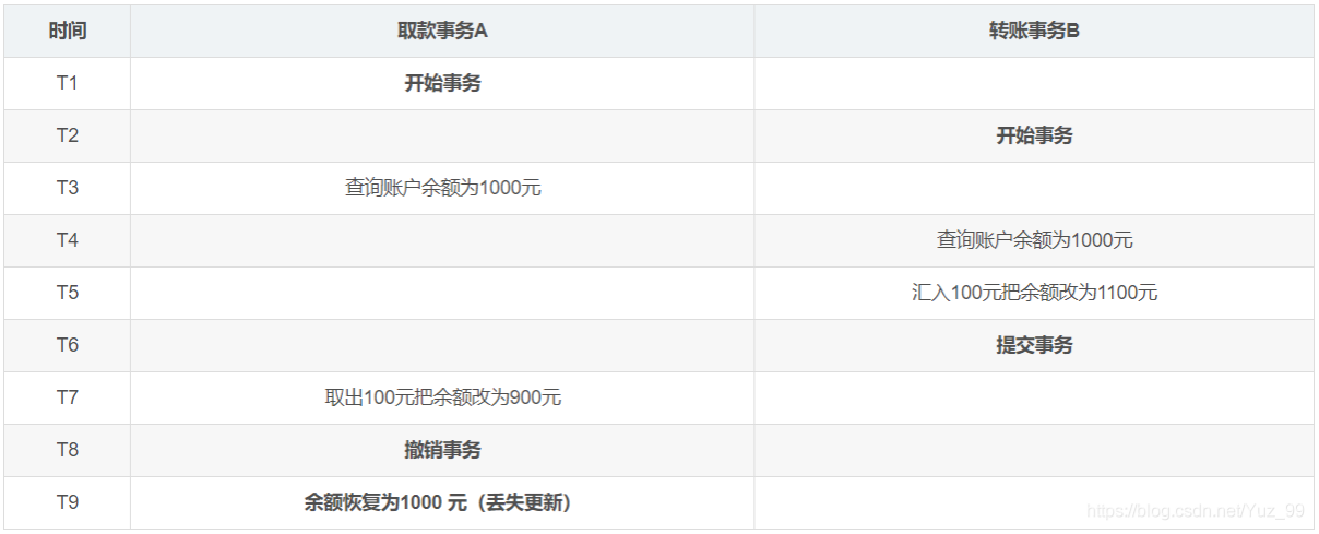 - 丢失更新:两个不同的事务在某一时刻对统一数据进行读取后,先后进行修改,导致第一次操作数据丢失