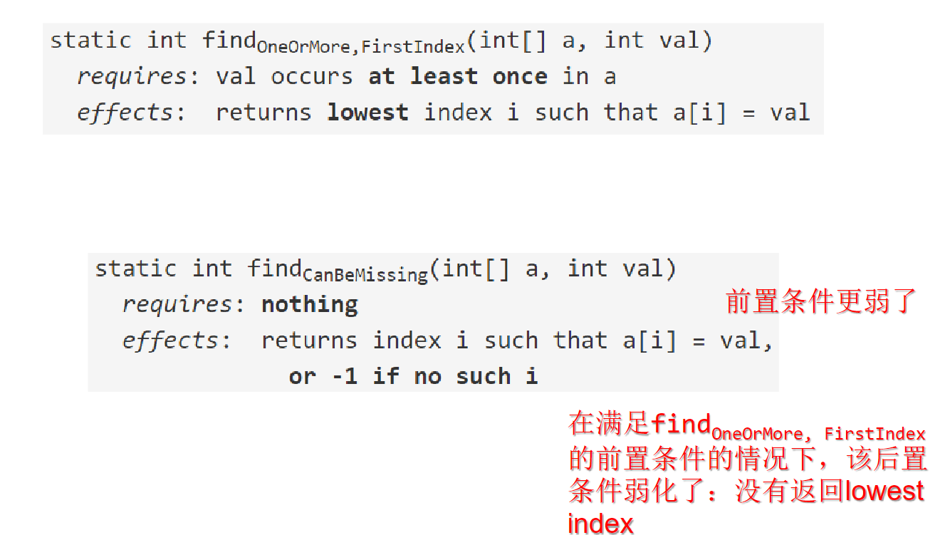 而下图两个规约的强度则无法比较,相较于第一个规约,第二个的前置条件更弱了;但在满足第一个规约的前置条件的情况下,第二个规约相较于第一个其后置条件也弱化了(没有返回最低索引值)。