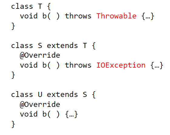 - 子类型中重写的方法不能抛出额外的异常,相同或符合co-variance的异常