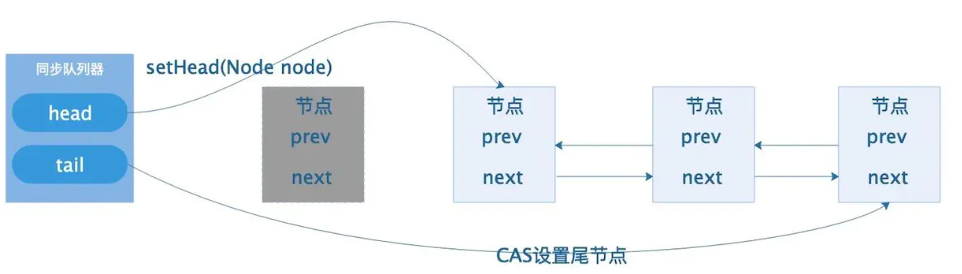 当前线程到头部的时候,尝试CAS更新锁状态,如果更新成功表示该等待线程获取成功。从头部移除。因为等待队列是从尾进从头出