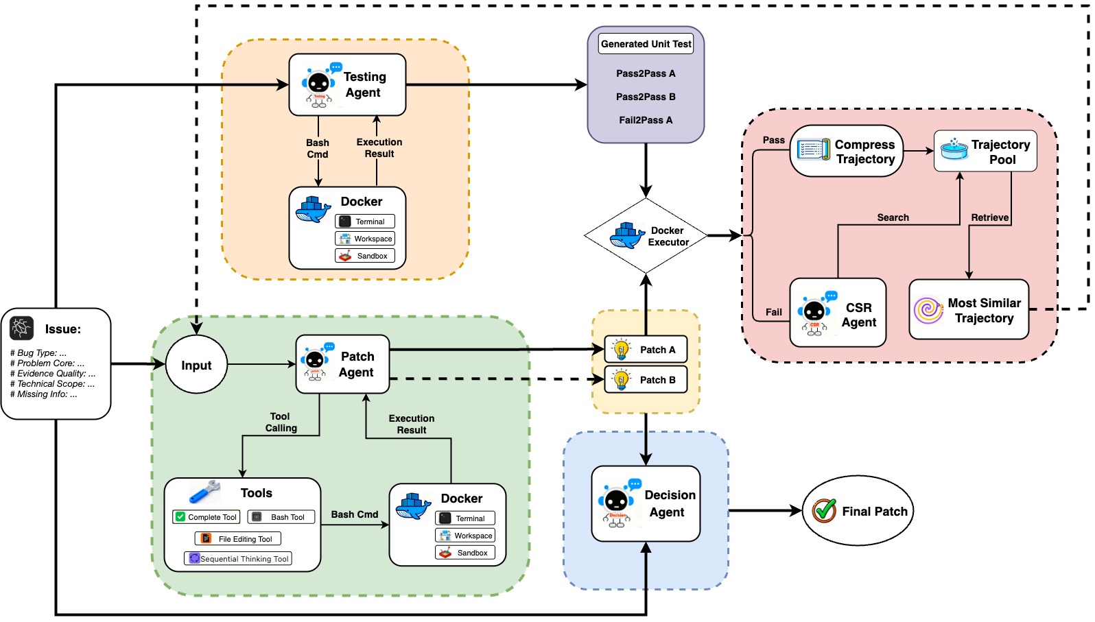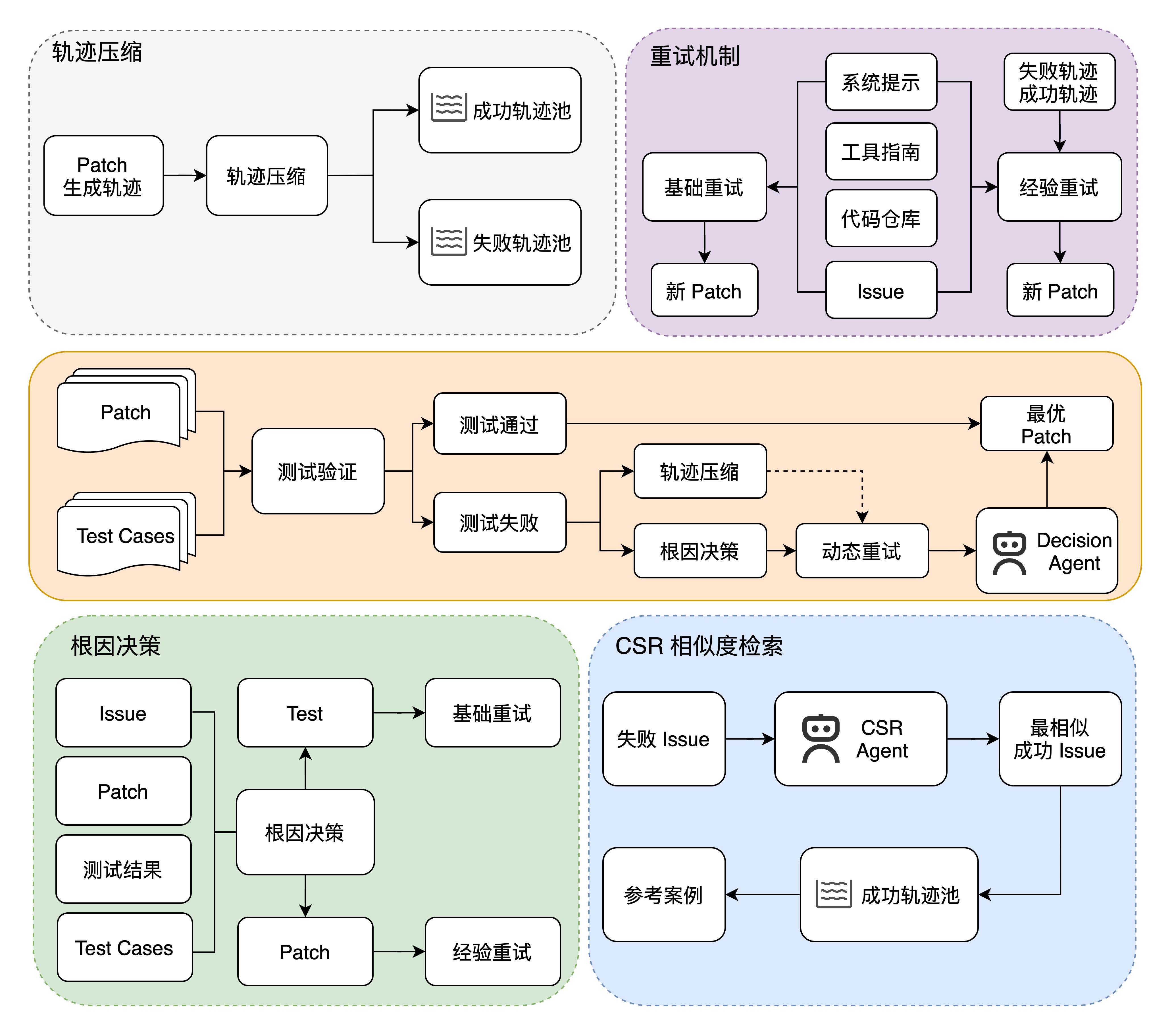 该 Agent 是系统在测试用例成功生成,但代码补丁未能通过测试用例的情况下所激活的一套高级错误诊断与自我优化的调度 Agent。它通过轨迹压缩、根因决策、CSR 相似度检索和经验重试,将第一次失败的原因和过往相似的成功经验作为第二次重试的先验知识,旨在通过借鉴多维历史经验来指导并优化新Patch的生成。