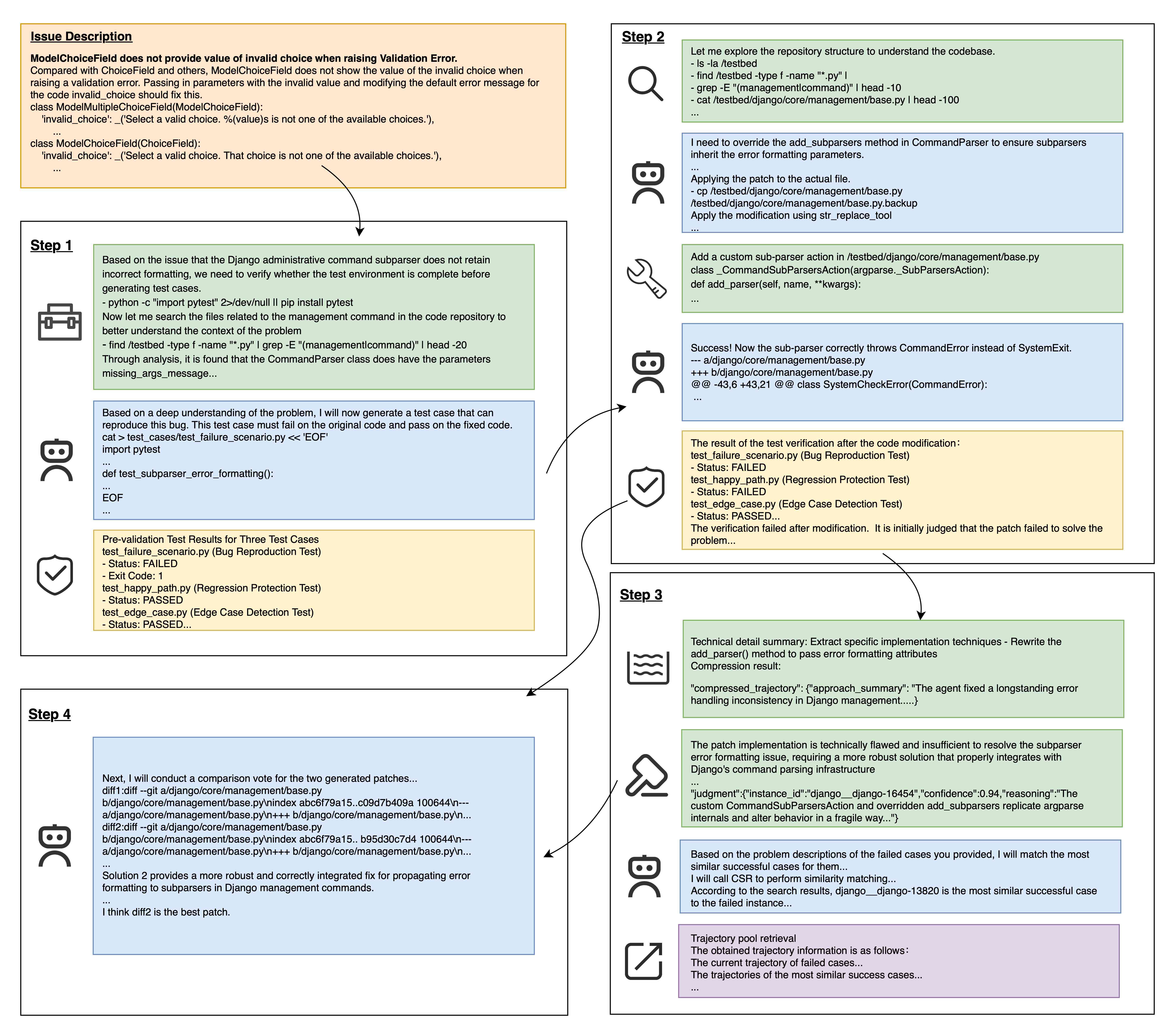 如下图,我们以 django-16454 实例为例详细阐述一个完整的工作流程,整个过程通过四个核心阶段,完成了真实代码仓库级问题的理解与解决。