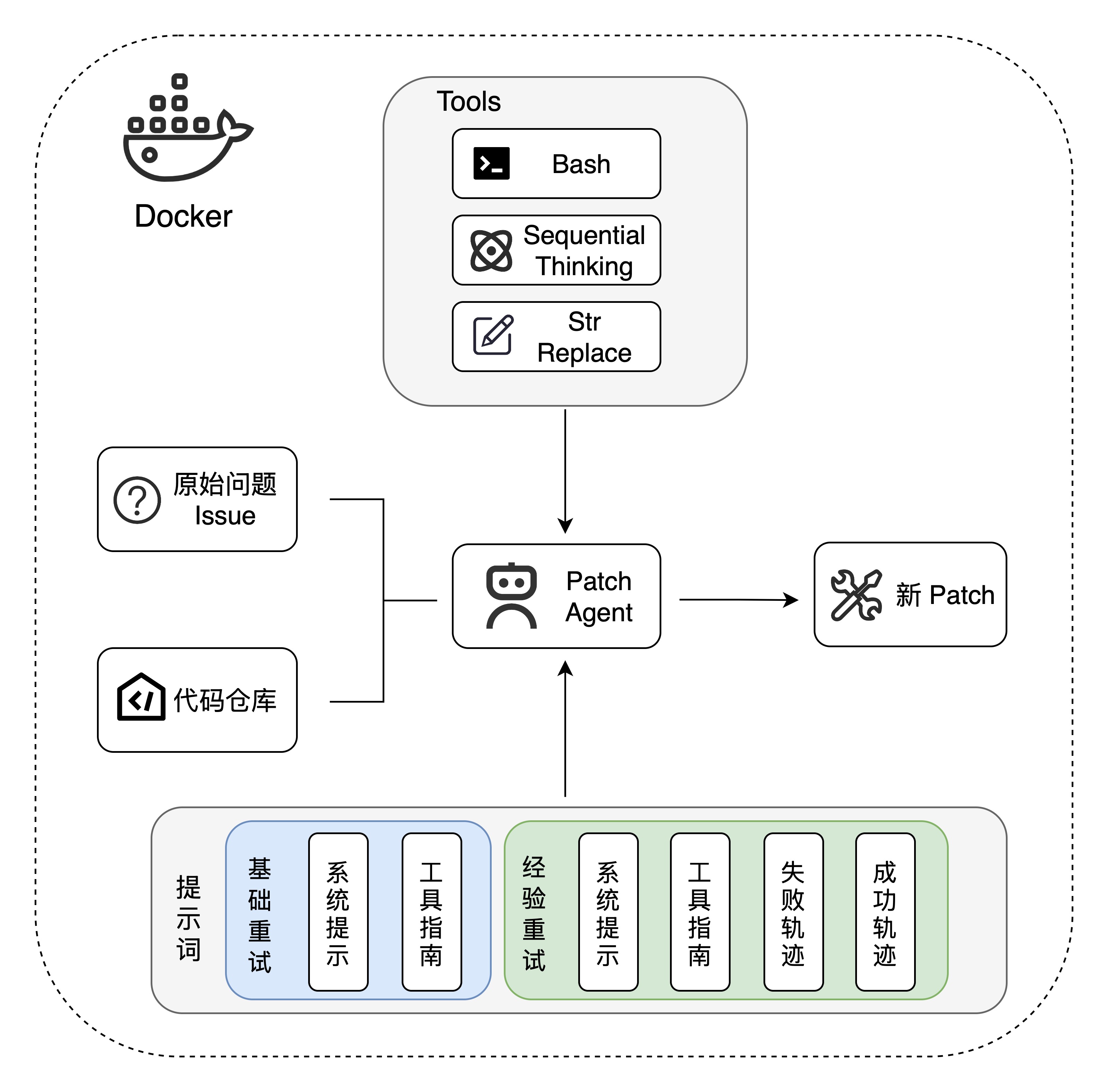 ▪将获取到的经验信息与上次失败(未能通过生成的测试套件)的 Patch 的压缩轨迹传递给 Patch Agent 进行经验重试。