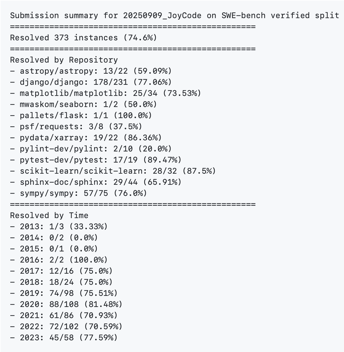 在权威SWE-Bench Verified基准测试中,JoyCode Agent凭借 74.6% 的高通过率