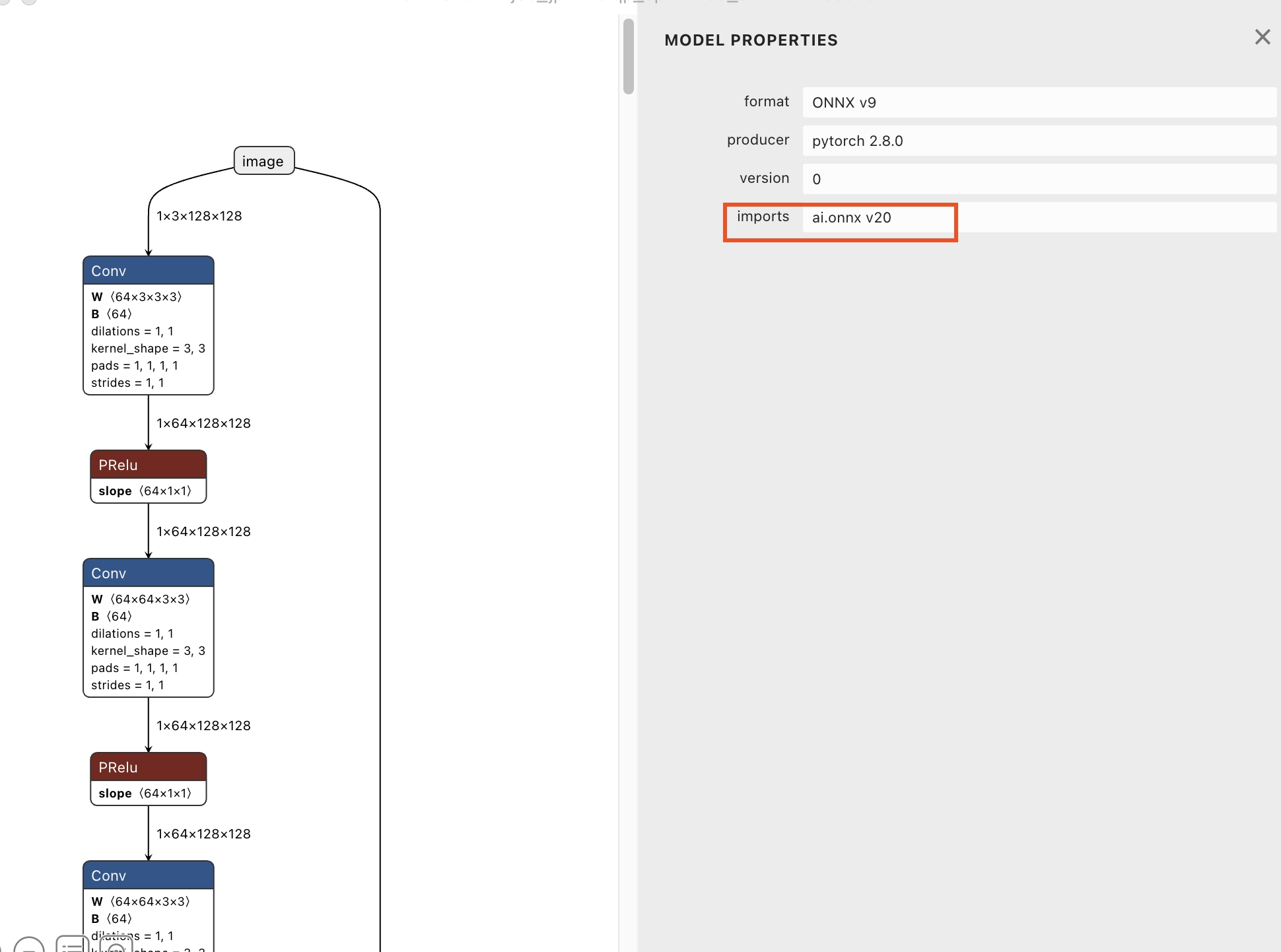 当前使用CANN进行模型转换, 支持ONNX opset版本7~18(最高支持到V1.13.1), 首先需要查看原始的onnx模型的opset版本是否在支持范围, 这里我们使用Netron(点击下载)可视化工具进行查看。