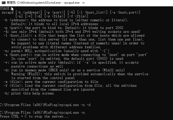 在winpcap的安装文件夹内找到rpcapd程序,在cmd中执行以下命令。