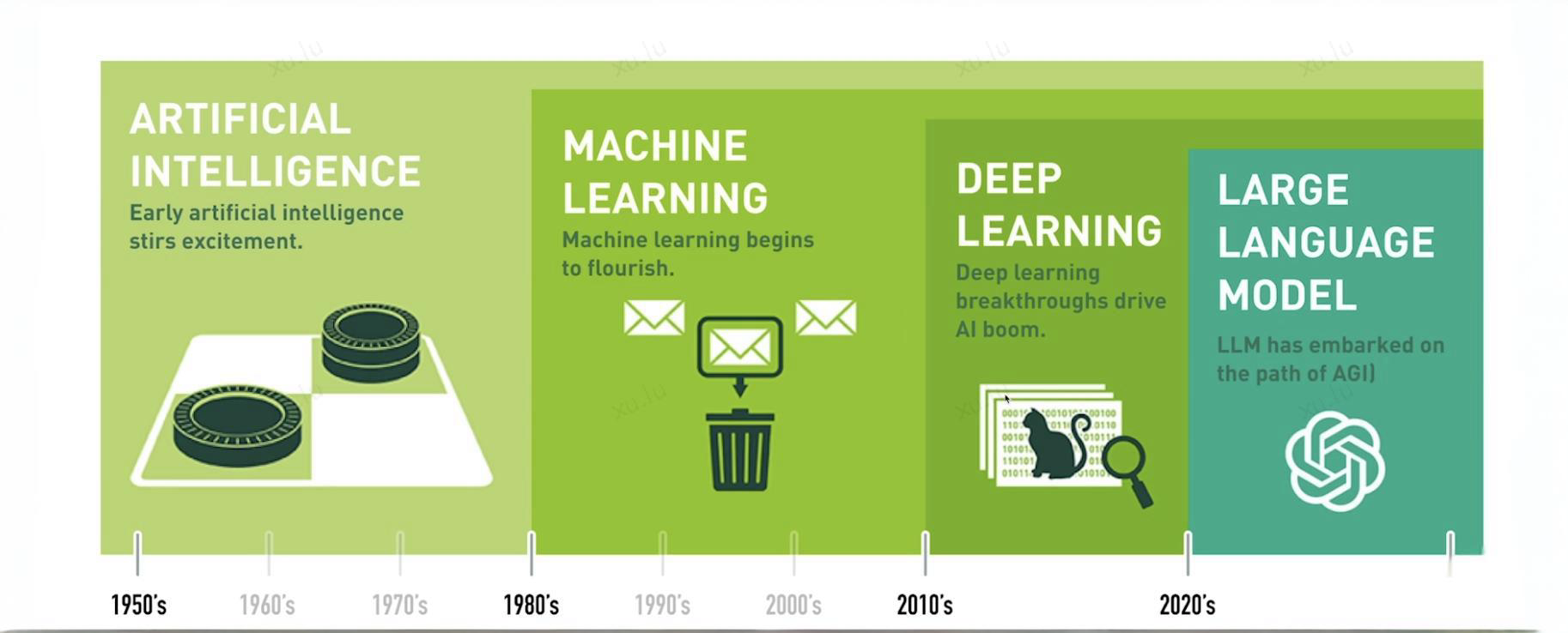 AI 本质就是 “让机器像人一样思考、干活” 的技术体系 —— 不用人一步步指挥,机器能自己学规律、做决策。比如手机人脸识别、聊天机器人、自动驾驶,都是 AI 的具体应用。它不是单一技术,而是一堆技术的 “总称”,就像 “家电” 包含冰箱、电视一样。这张网上流行的图概述了人工智能(AI)随着时间推移的发展历程,从早期阶段到机器学习、深度学习以及大型语言模型(LLM)的出现。