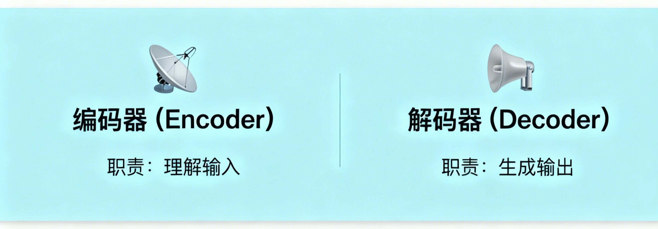 •核心结构:分 “编码器(Encoder)” 和 “解码器(Decoder)”—— 编码器负责 “理解信息”(比如读文章),解码器负责 “生成信息”(比如写文章);
