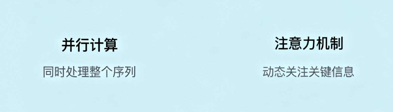 •核心创新:“并行计算 + 注意力机制”—— 不用逐字处理,能同时分析多个关键词,还能记住词与词的关系,又快又准;