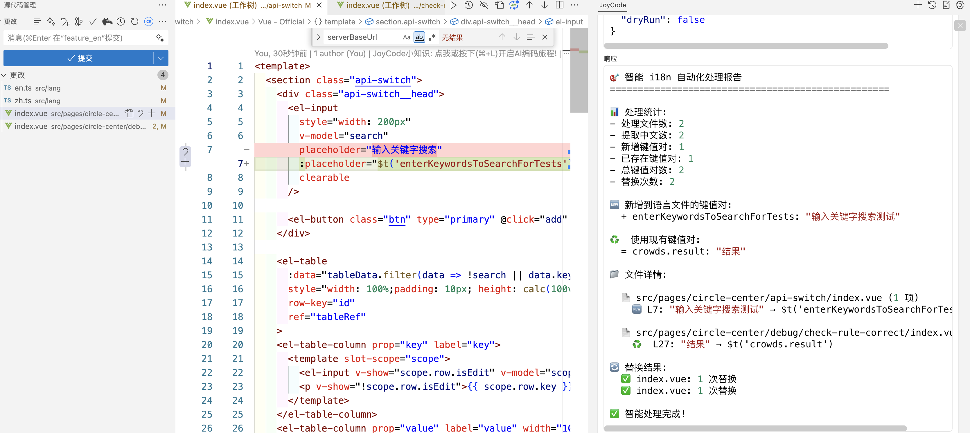 preview-changes 工具展示即将变更的代码对比,确保修改符合预期。extract-and-replace 工具,将源代码中的硬编码字符串精准替换为国际化方法(如 $t('pleaseSelect'))。