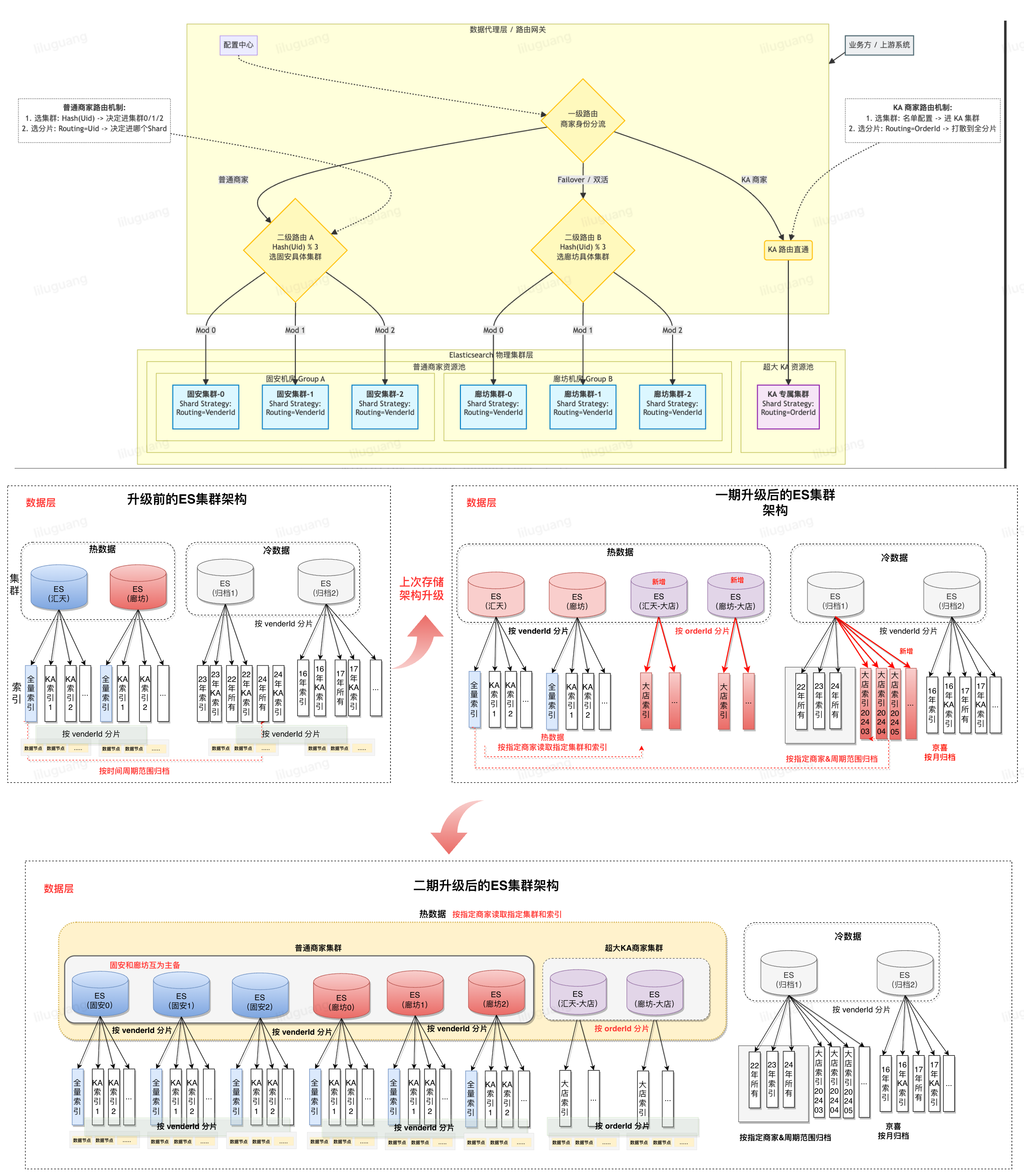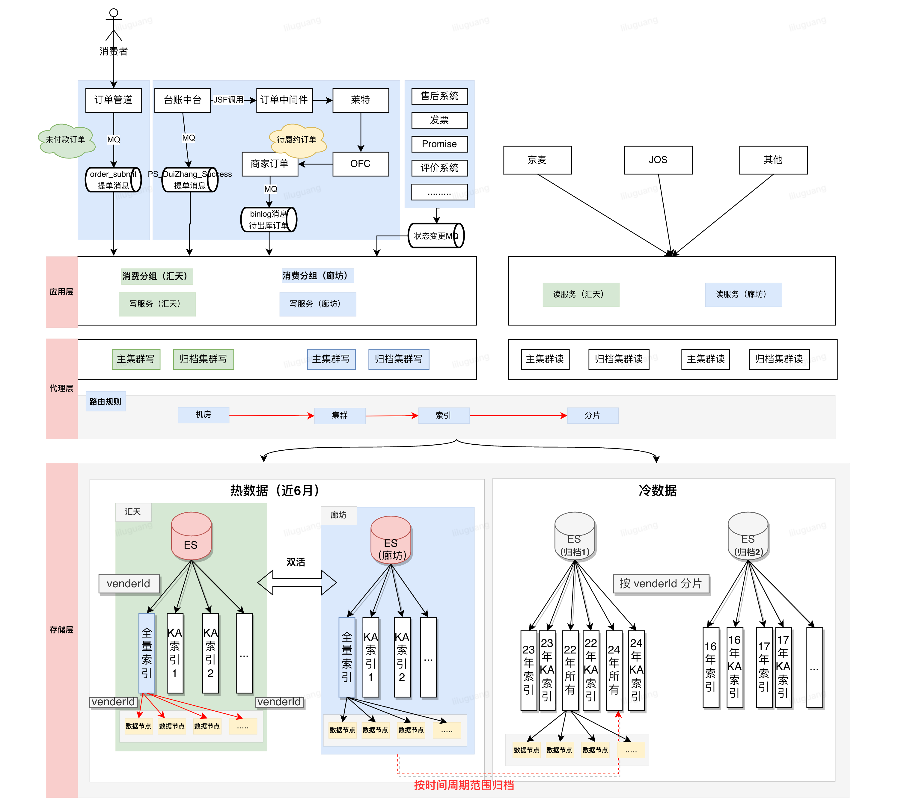 •存储层采用ES做为存储介质,分为热集群、归档集群;热集群存储近8个月的订单数据,单个集群有98个节点(3个主节点,10个网关节点,85个数据节点)。集群中共计12个索引,其中11个KA索引(存储大商家订单数据),每个索引只有1个主分片(1副本);普通商家索引有96各数据分片(1副本);冷集群存储了16年至2024年所有的订单数据,每年创建一个索引,每个索引96分片(1副本)。