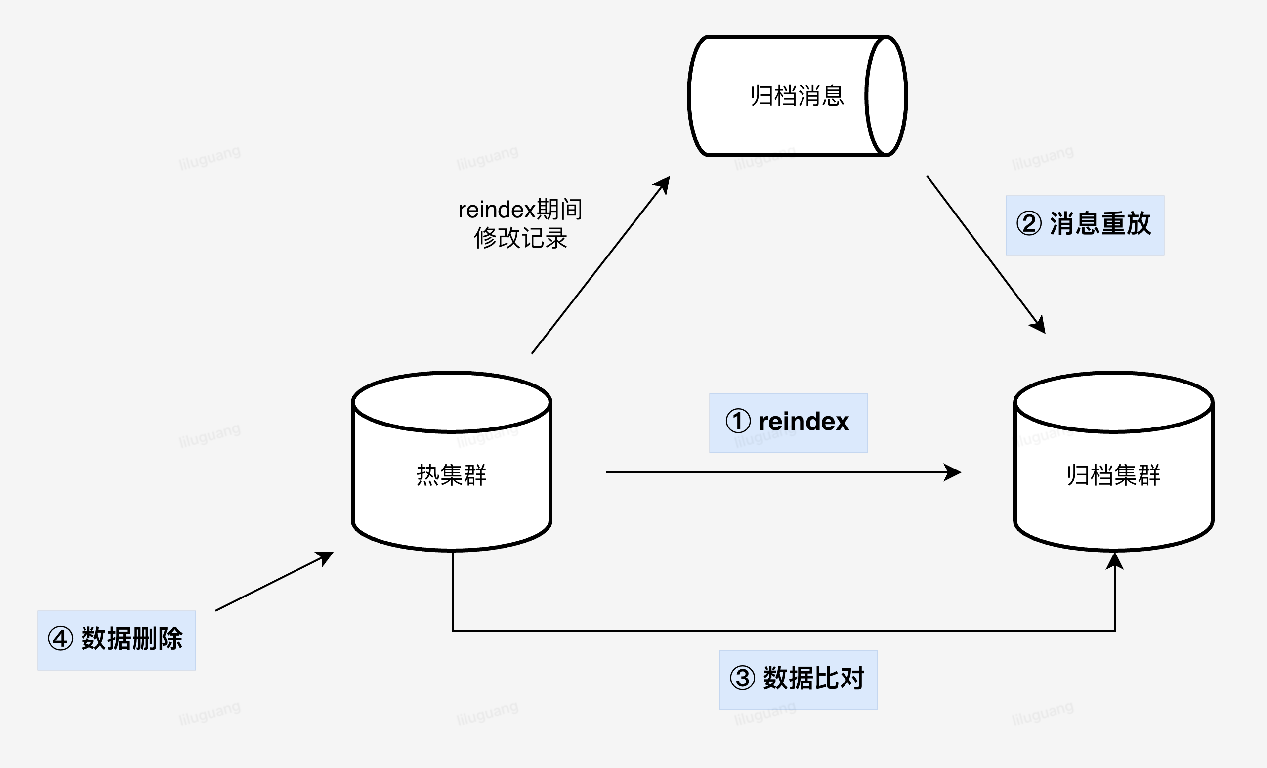 第一阶段通过通过reindex方式迁移数据,然后通过回放归档消息的方式追齐过程中的数据变更。该方案一定程度缩减了整体的时间及工作量,相较之前效率上大幅提升,时间大概由原来的20多天缩减至10天左右。