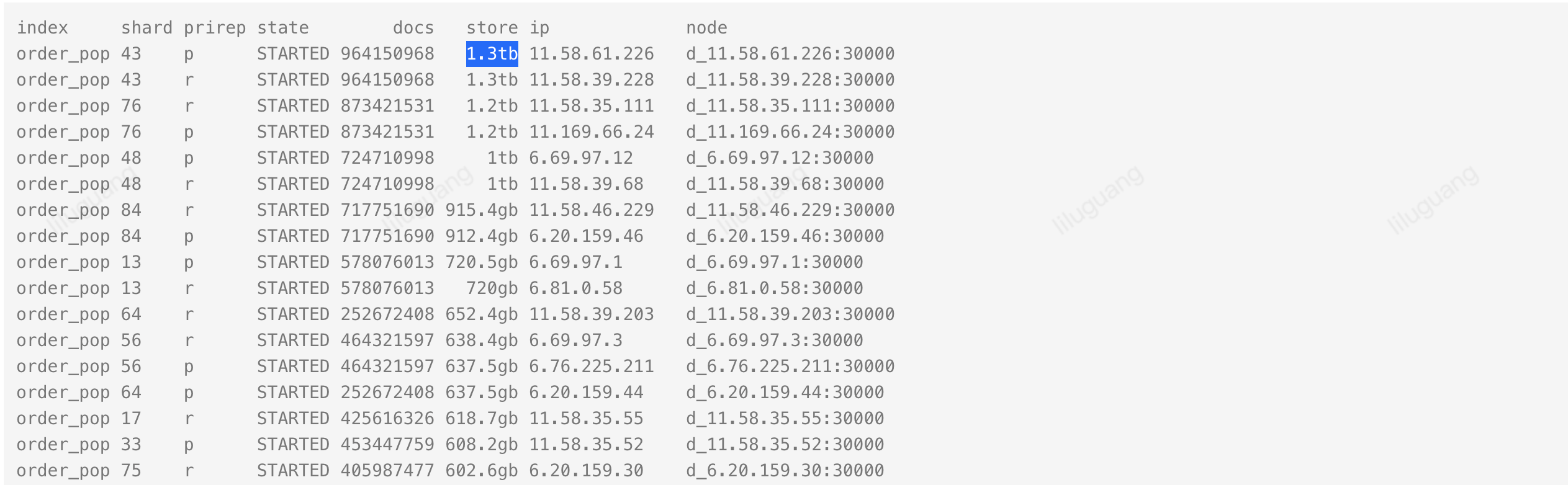 1、目前POP订单ES存在较严重的数据倾斜问题,由于是B端订单检索为了不跨索引和分片检索数据,是以venderId维度进行路由分片,确保同一个商家的订单数据存储在同一个分片。但商家的经营情况差异较大,如上边所说京喜自营做为一个京东自己运营的店铺,订单体量可以占到总订单量的1/4,类似于这样的大商家落到一个数据分片会导致某个数据分片存储超级大,最大的数据分片已经到了1TB以上。大商家的一个复杂检索查询会对所有在该分片上的商家产生较大性能波动,同时若硬件故障大分片数据在恢复迁移时都是在灾难性的。下边是升级前汇天集群部分分片数据的统计信息,数据差异达5倍之多。