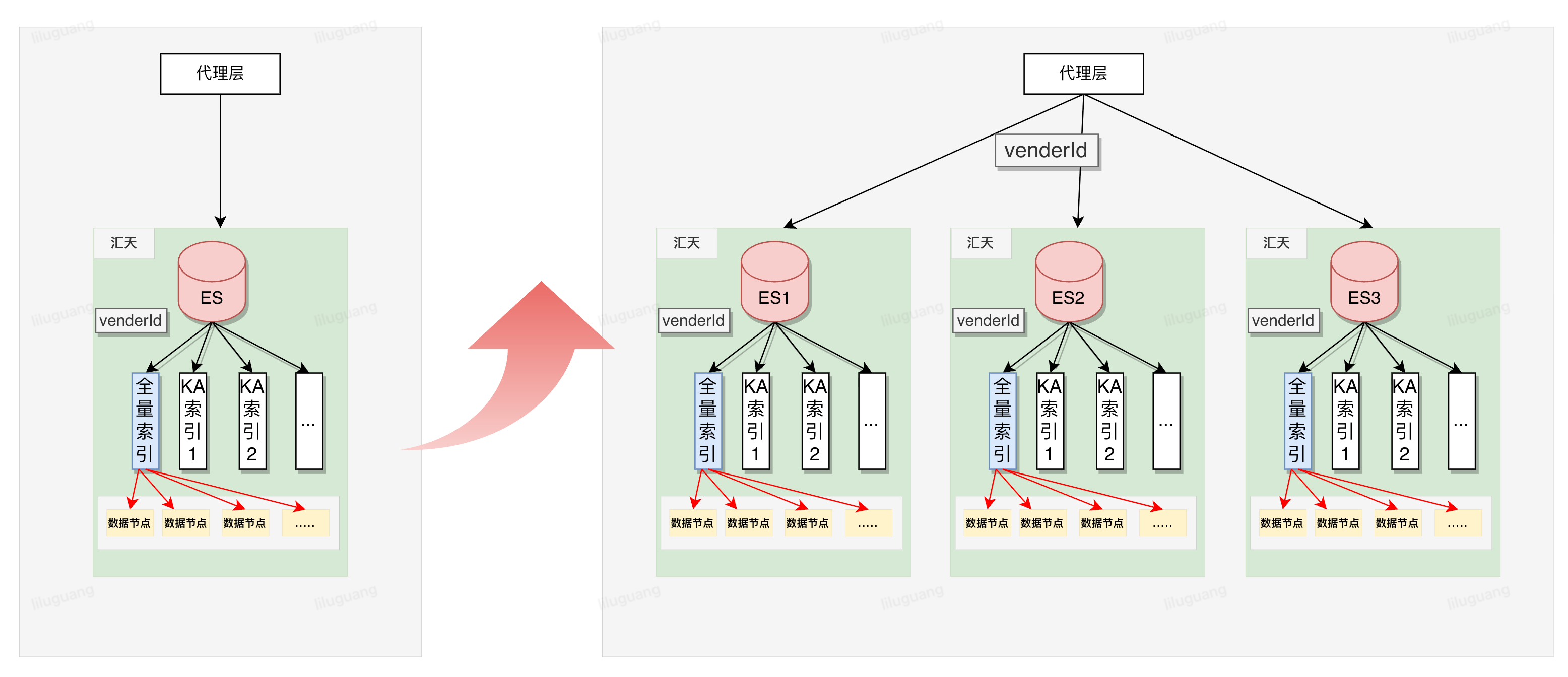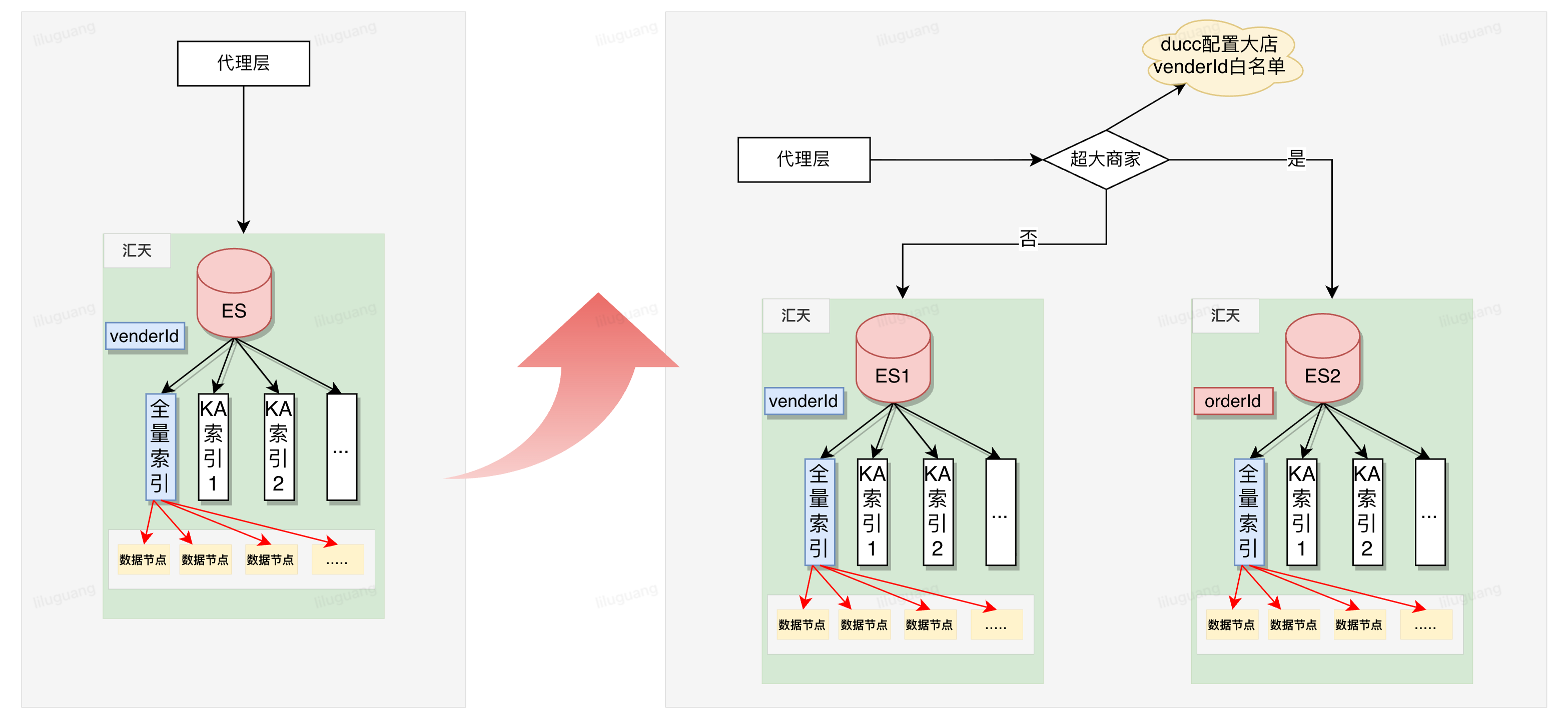 1.物理层隔离,降低影响:为大商家申请独立集群进行存储,在独立集群中为每个商家创建独立索引并根据体量配置不同的分片数量。代理层增加大商家虚拟路由逻辑,将大商家的请求routing到独立集群中指定索引,降低了大商家对其他商家带来的不确定性影响。