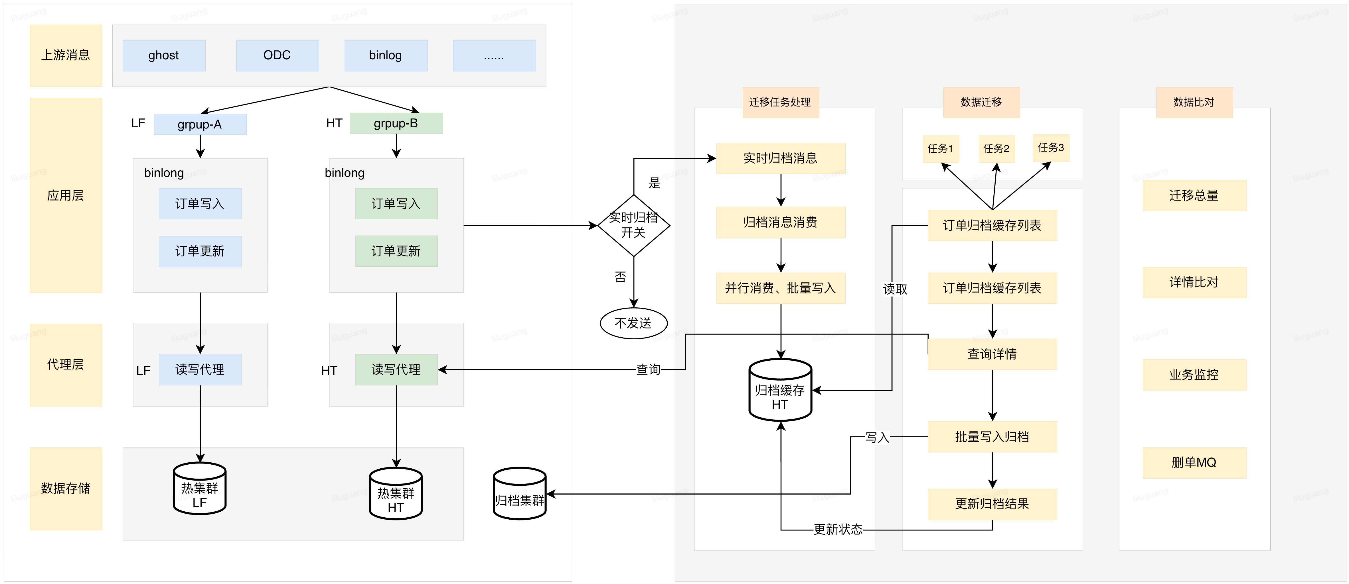 4、数据维护成本高,目前我们有冷热两个集群,每年两次大促前需要将热集群中超过5个月以上的订单迁移至归档集群,这个过程相对比较繁琐耗时长,DUCC变更、迁移数据、比对数据、灰度切流等等。周期较长主要是以下两个原因: