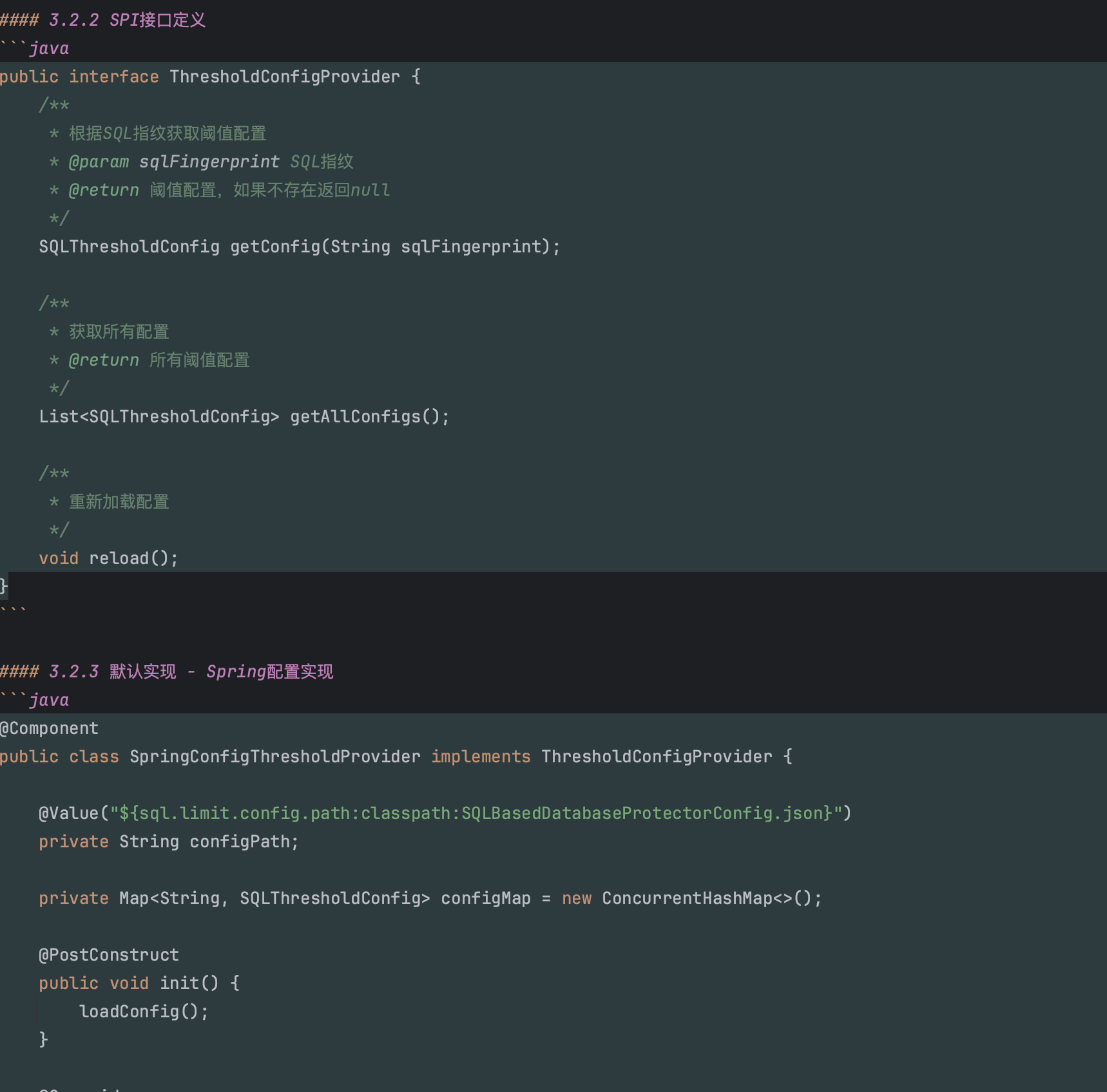2、定义接口,从中基于SQL指纹查询配置的阈值,该接口的默认实现是通过Spring配置文件加载该SQL指纹的阈值,还可以有其他实现,交给该插件的接入方来实现,通过 ServiceLoader SPI方式进行加载具体实现