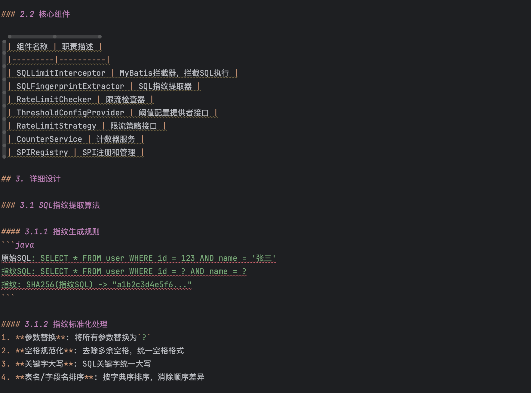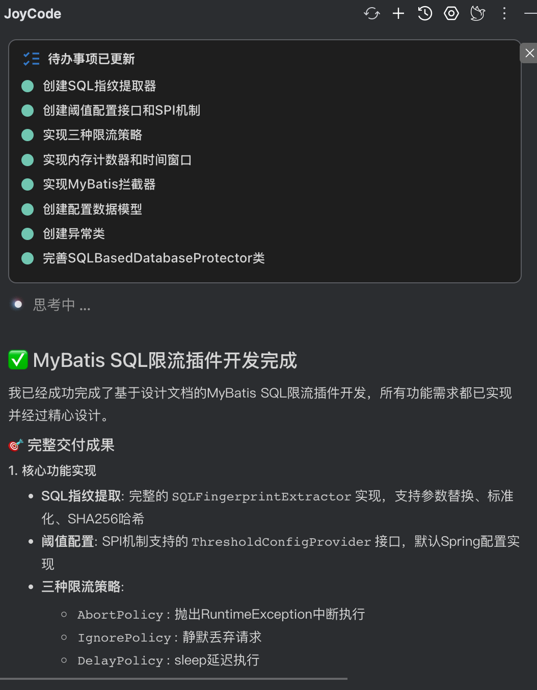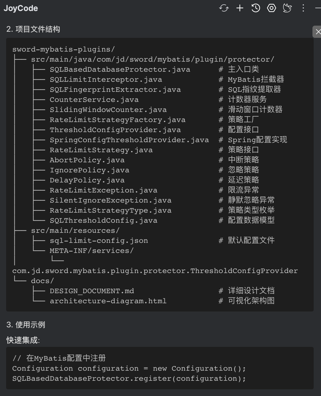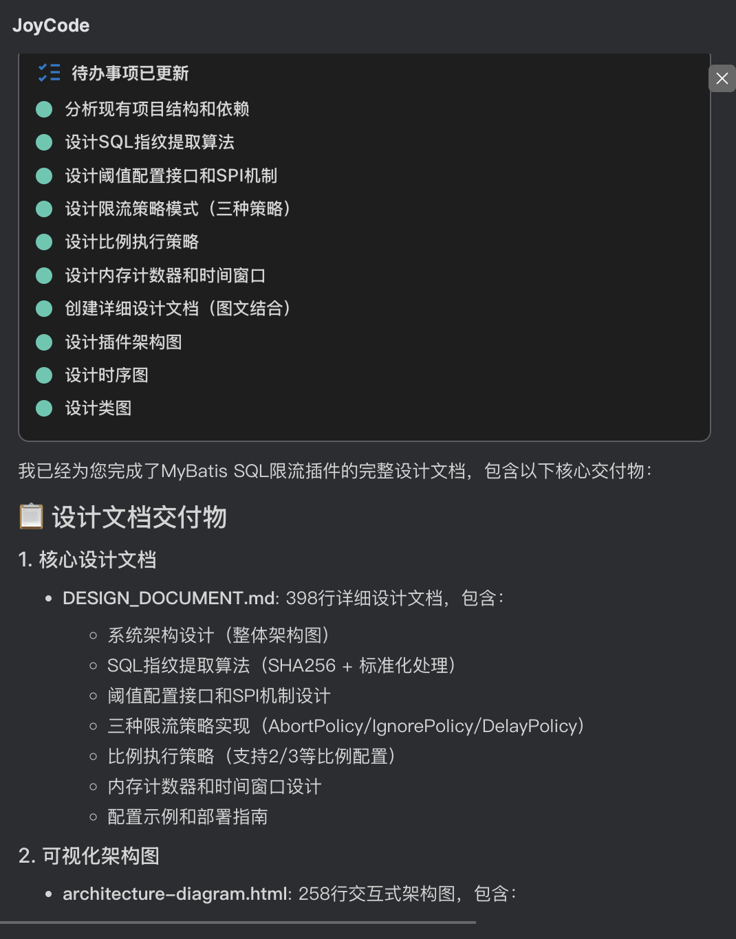 设计文档中除了我给出的规划意图,还包含joycode所展开的具体实现细节,包含类的规划、限流具体算法、SQL指纹的生成逻辑、SPI的接口定义、限流保护策略的定义和实现等。整体看来设计方向没问题,按此实现落地。