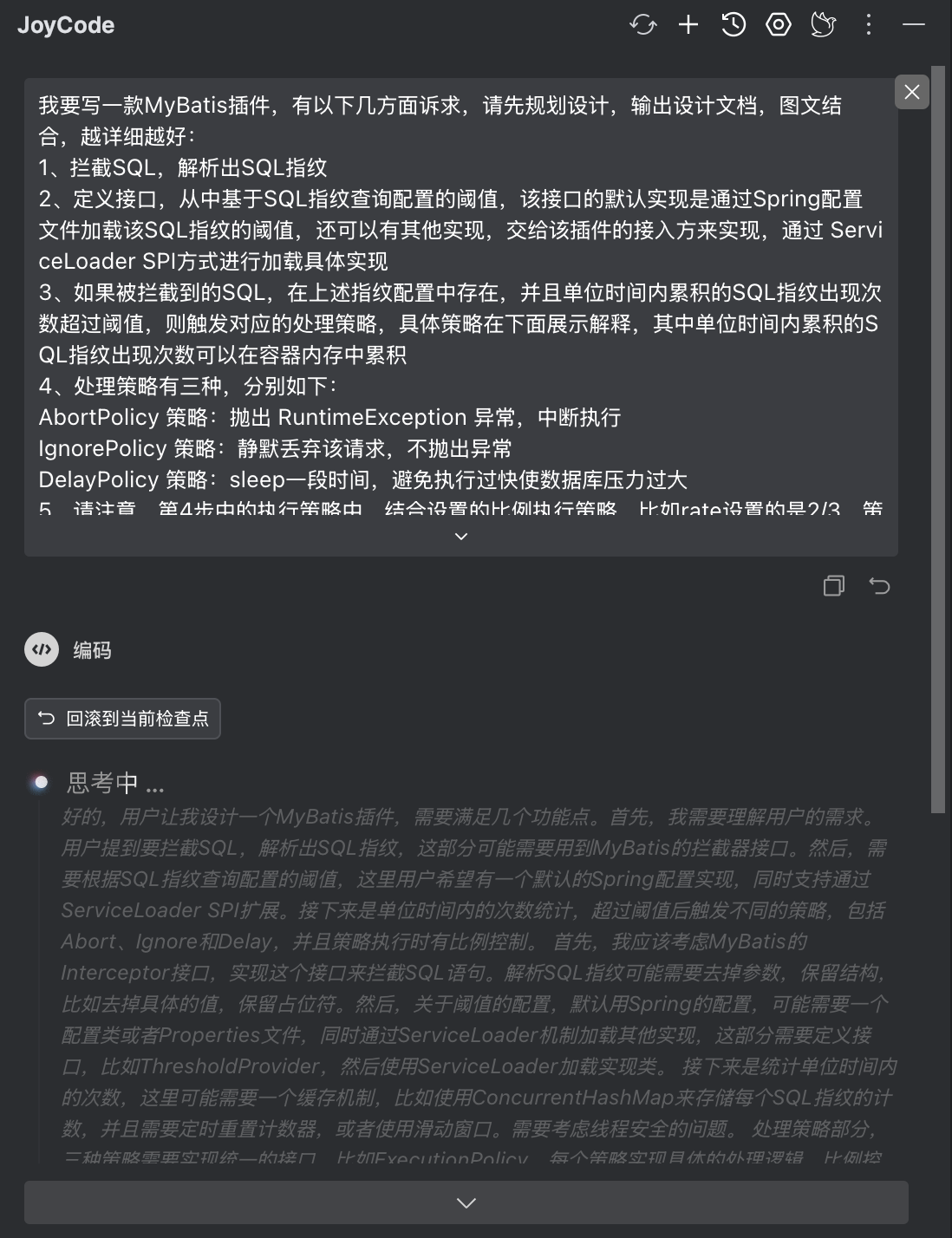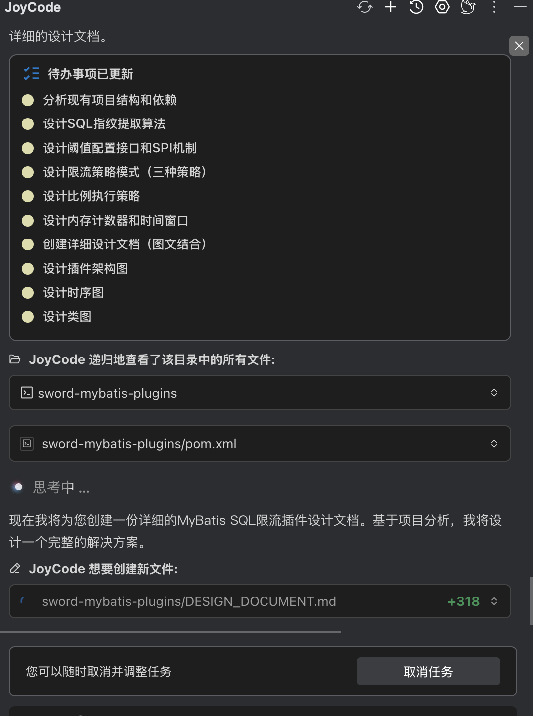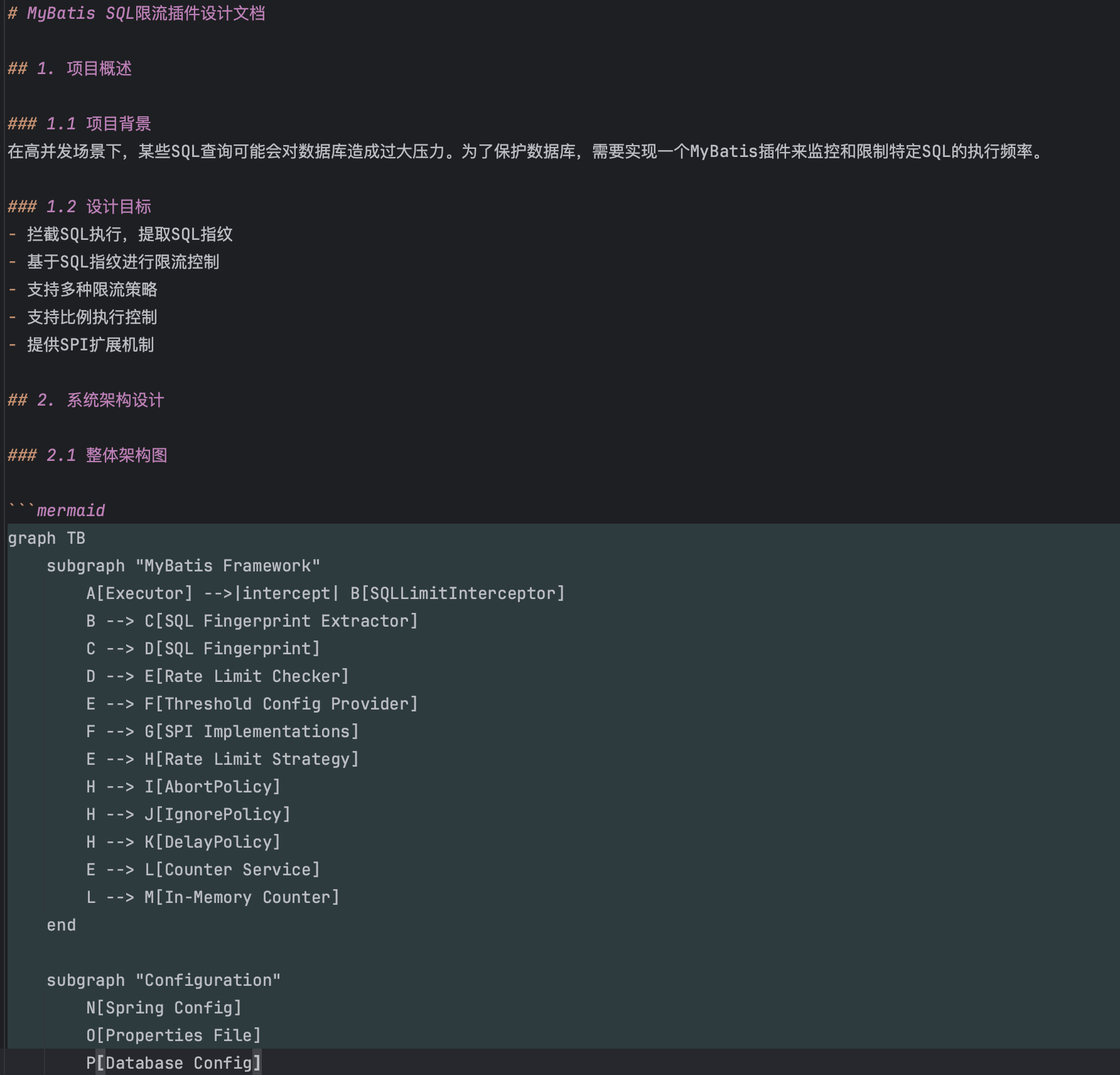 设计文档中除了我给出的规划意图,还包含joycode所展开的具体实现细节,包含类的规划、限流具体算法、SQL指纹的生成逻辑、SPI的接口定义、限流保护策略的定义和实现等。整体看来设计方向没问题,按此实现落地。