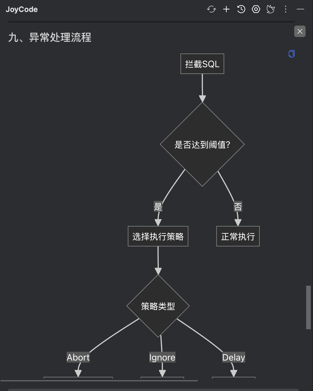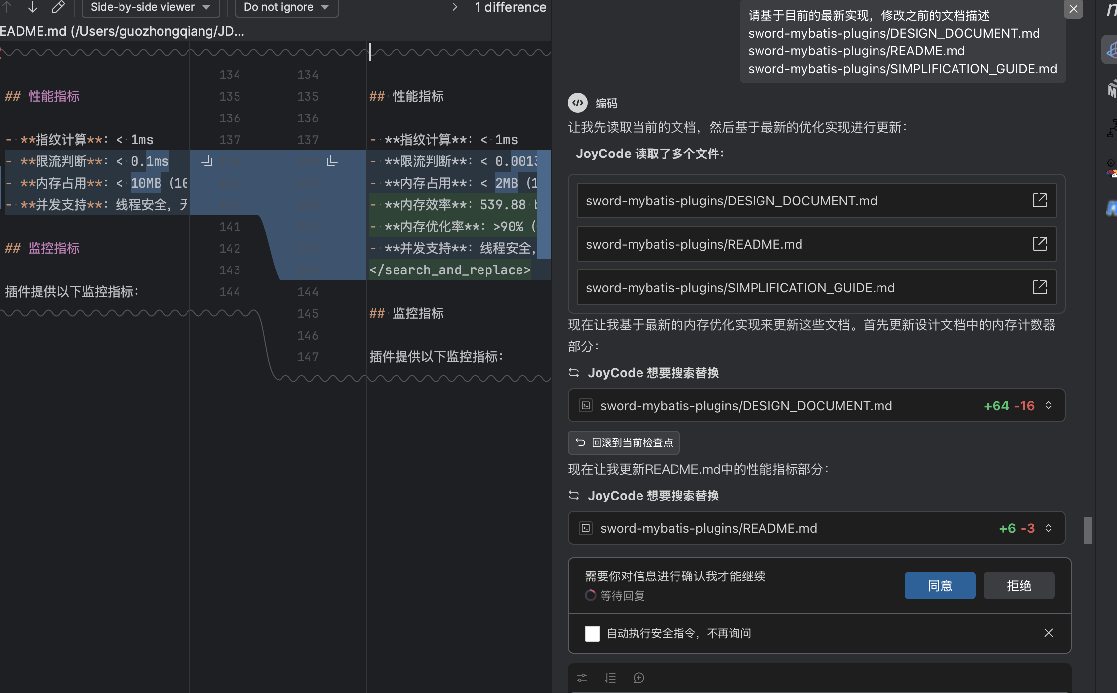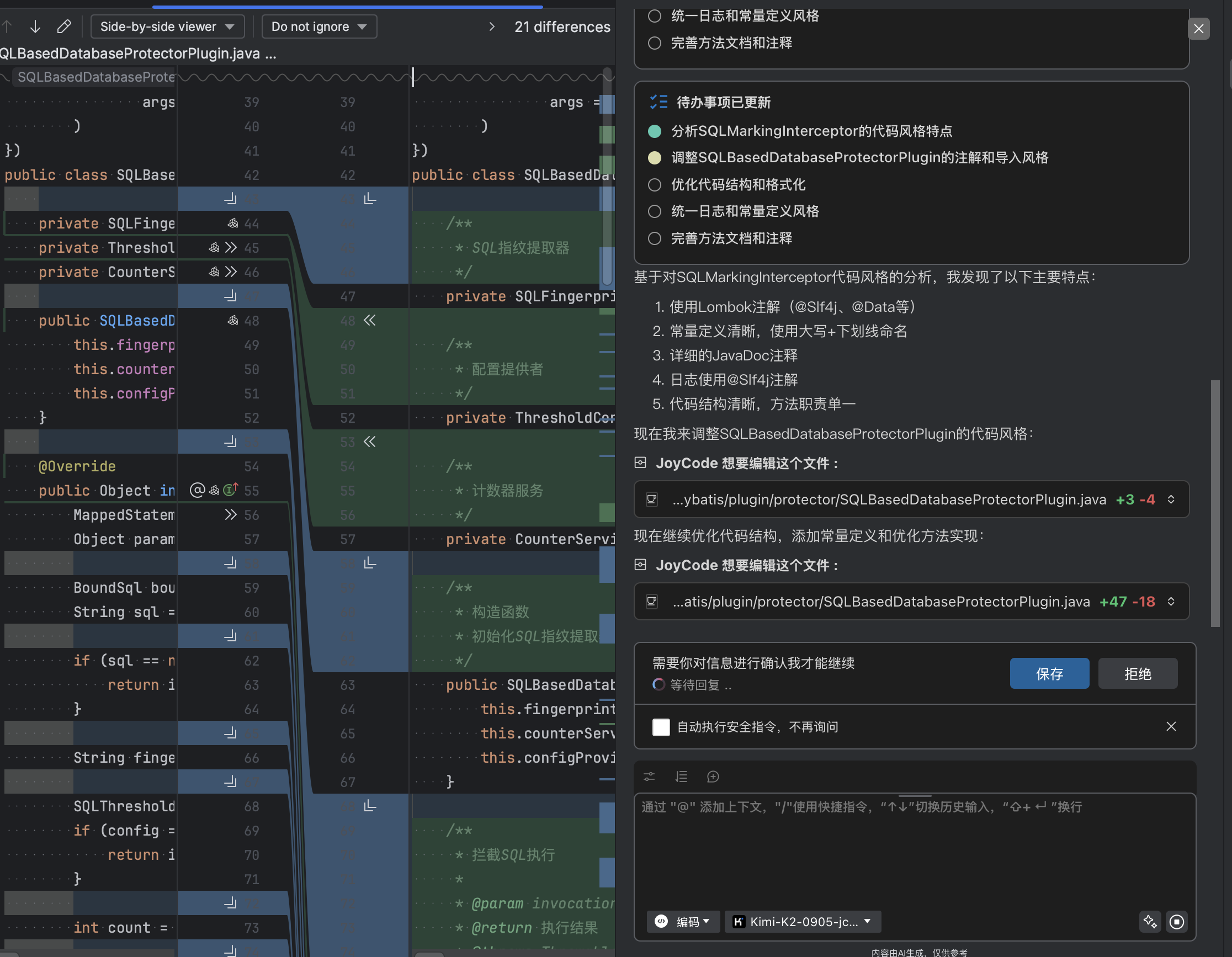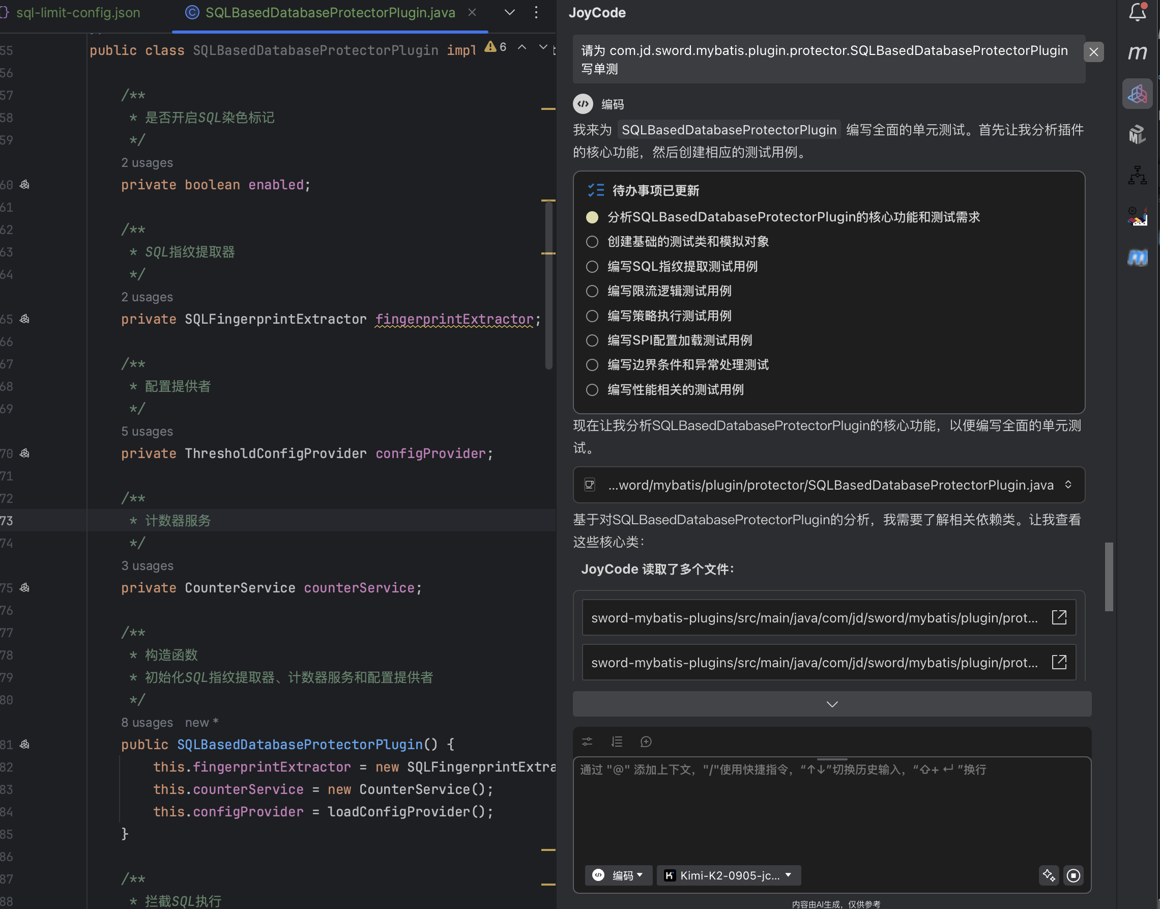 设计文档中除了我给出的规划意图,还包含joycode所展开的具体实现细节,包含类的规划、限流具体算法、SQL指纹的生成逻辑、SPI的接口定义、限流保护策略的定义和实现等。整体看来设计方向没问题,按此实现落地。