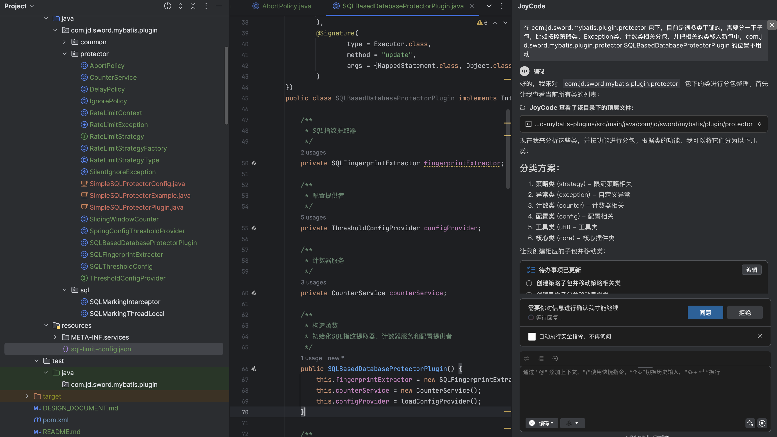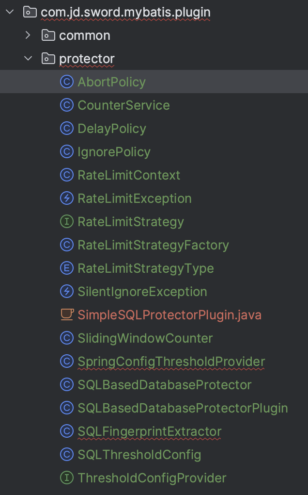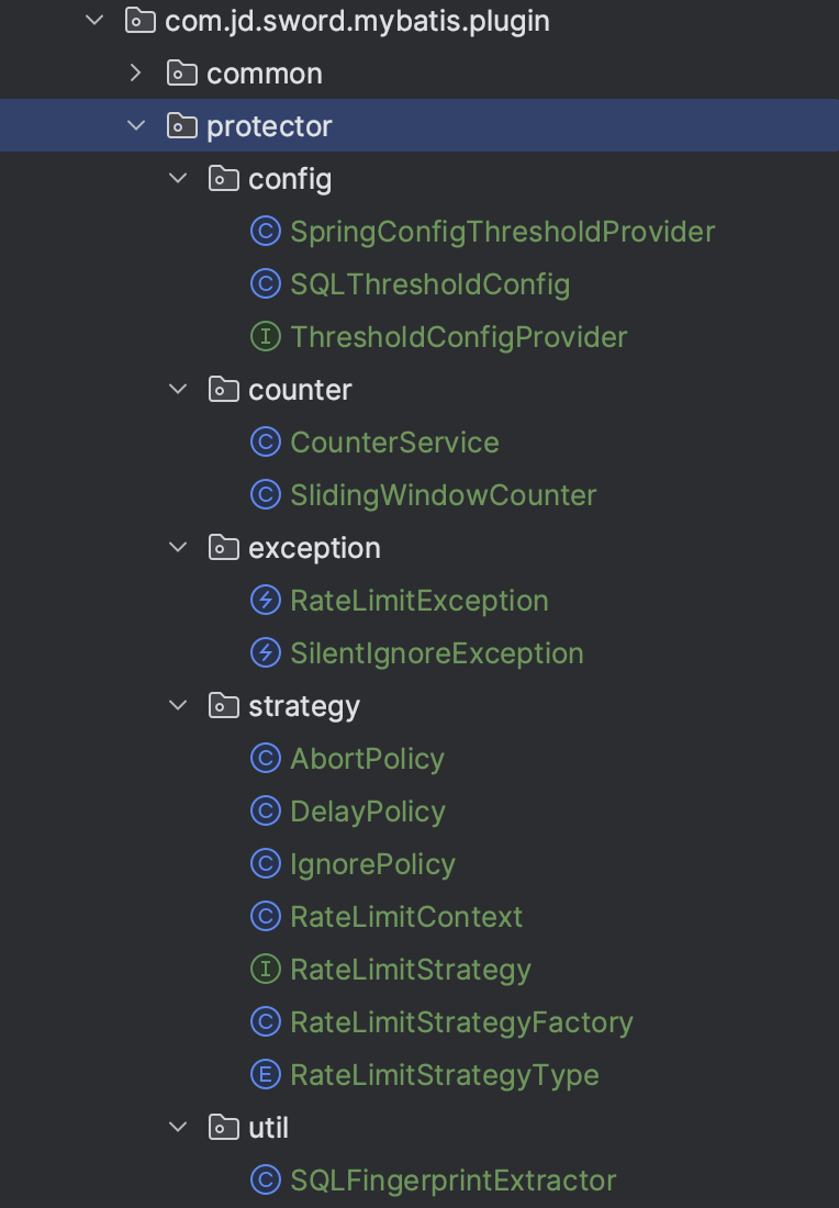 在 com.jd.sword.mybatis.plugin.protector 包下,目前是很多类平铺的,需要分一下子包,比如按照策略类、Exception类、计数类相关分包,并把相关的类移入新包中,com.jd.sword.mybatis.plugin.protector.SQLBasedDatabaseProtectorPlugin 的位置不用动