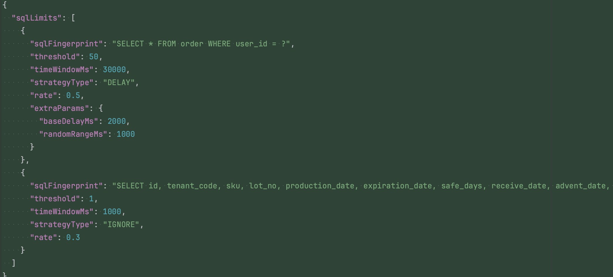 3、如果被拦截到的SQL,在上述指纹配置中存在,并且单位时间内累积的SQL指纹出现次数超过阈值,则触发对应的处理策略,具体策略在下面展示解释,其中单位时间内累积的SQL指纹出现次数可以在容器内存中累积