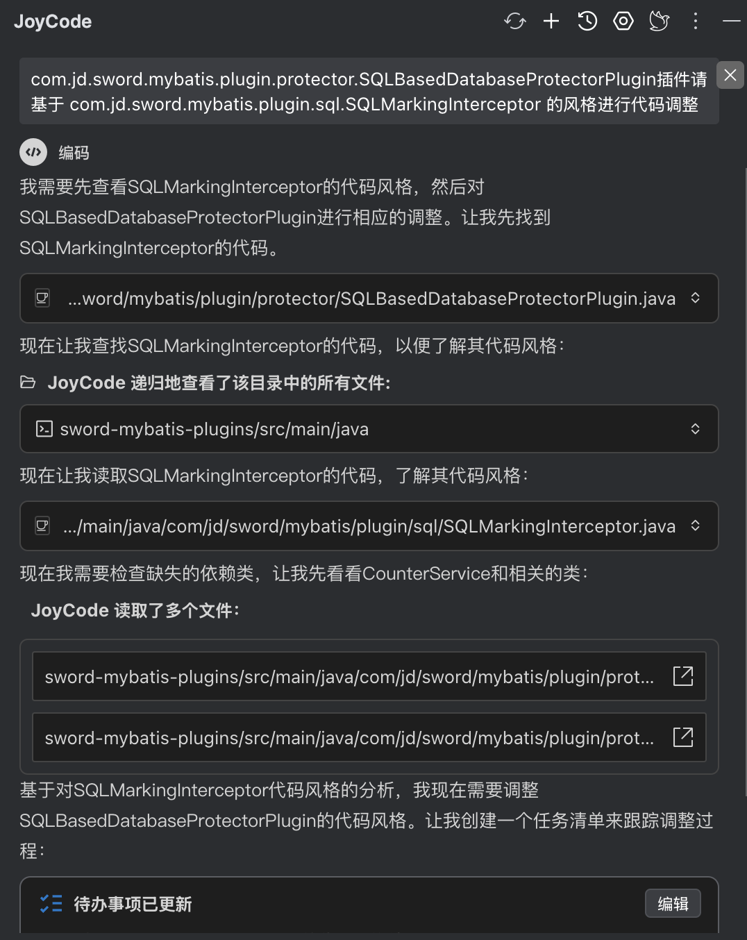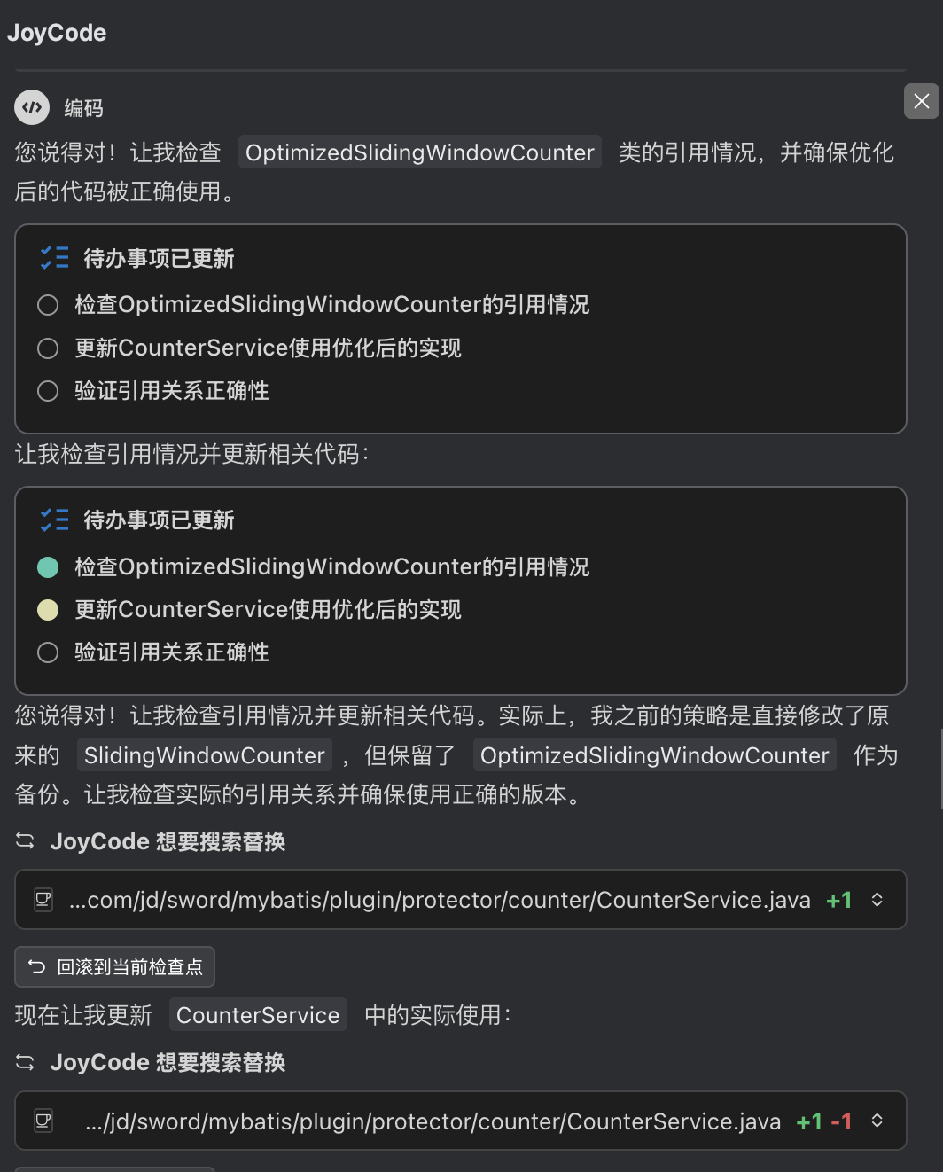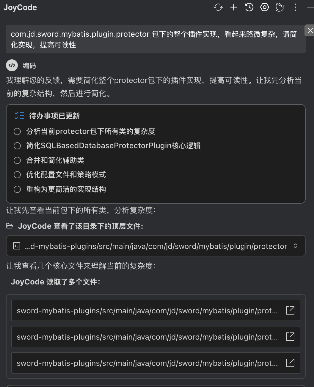 在分包优化这块,因为拆分了很多子包,类的package需要调整,引用import也需要调整,joycde也识别到了工作的复杂性,尝试写批量脚本处理,因为来回处理了一会,比较费时,我感觉人工处理更快,选择停止任务,人工调整包。