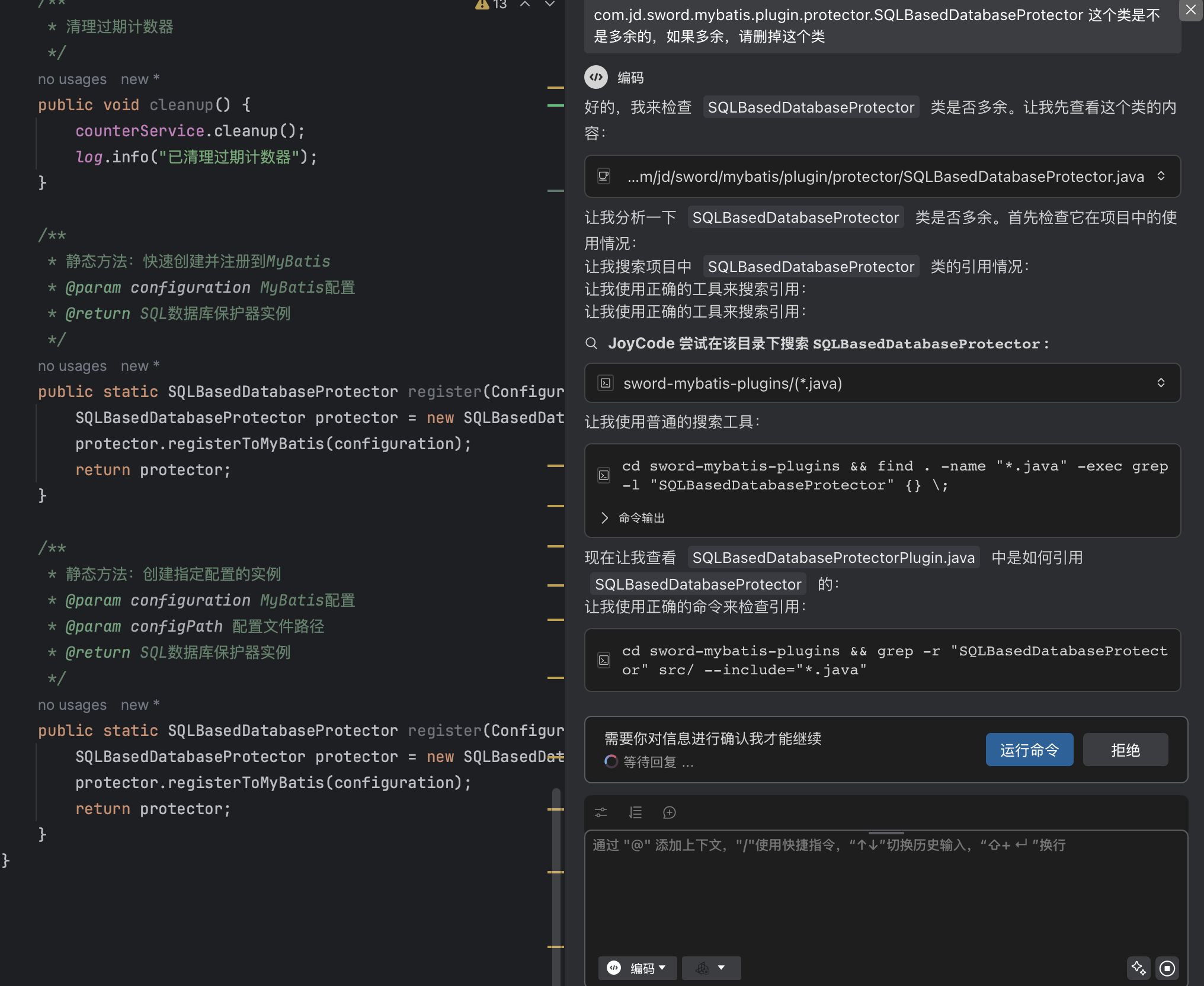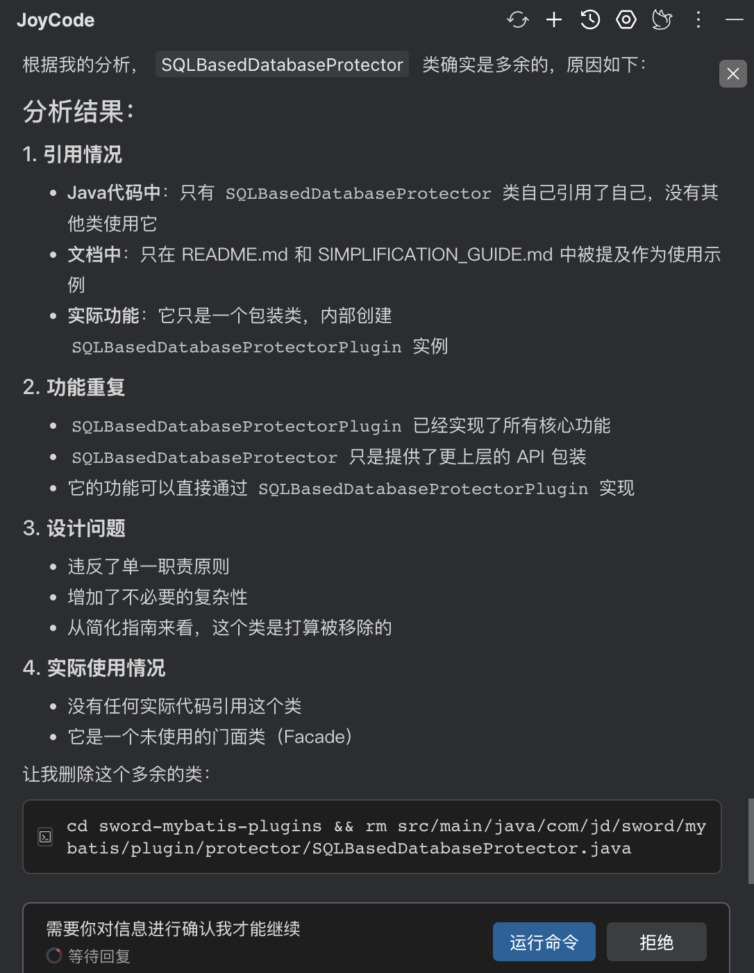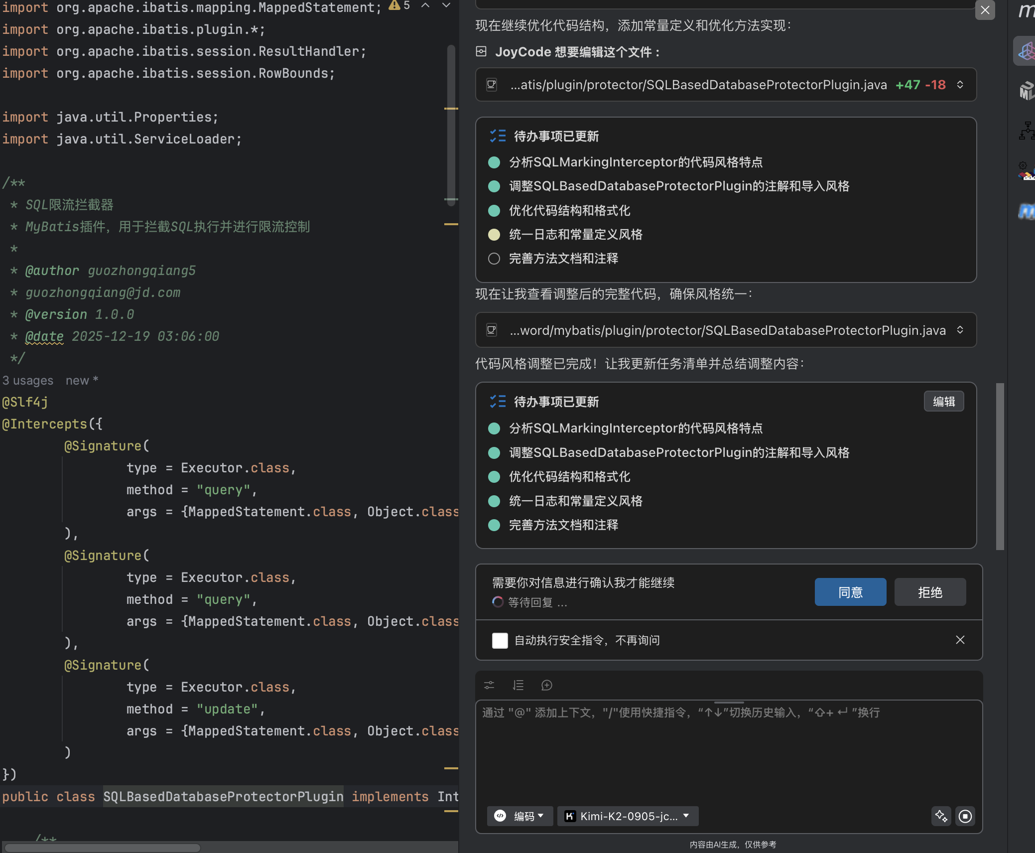 在分包优化这块,因为拆分了很多子包,类的package需要调整,引用import也需要调整,joycde也识别到了工作的复杂性,尝试写批量脚本处理,因为来回处理了一会,比较费时,我感觉人工处理更快,选择停止任务,人工调整包。