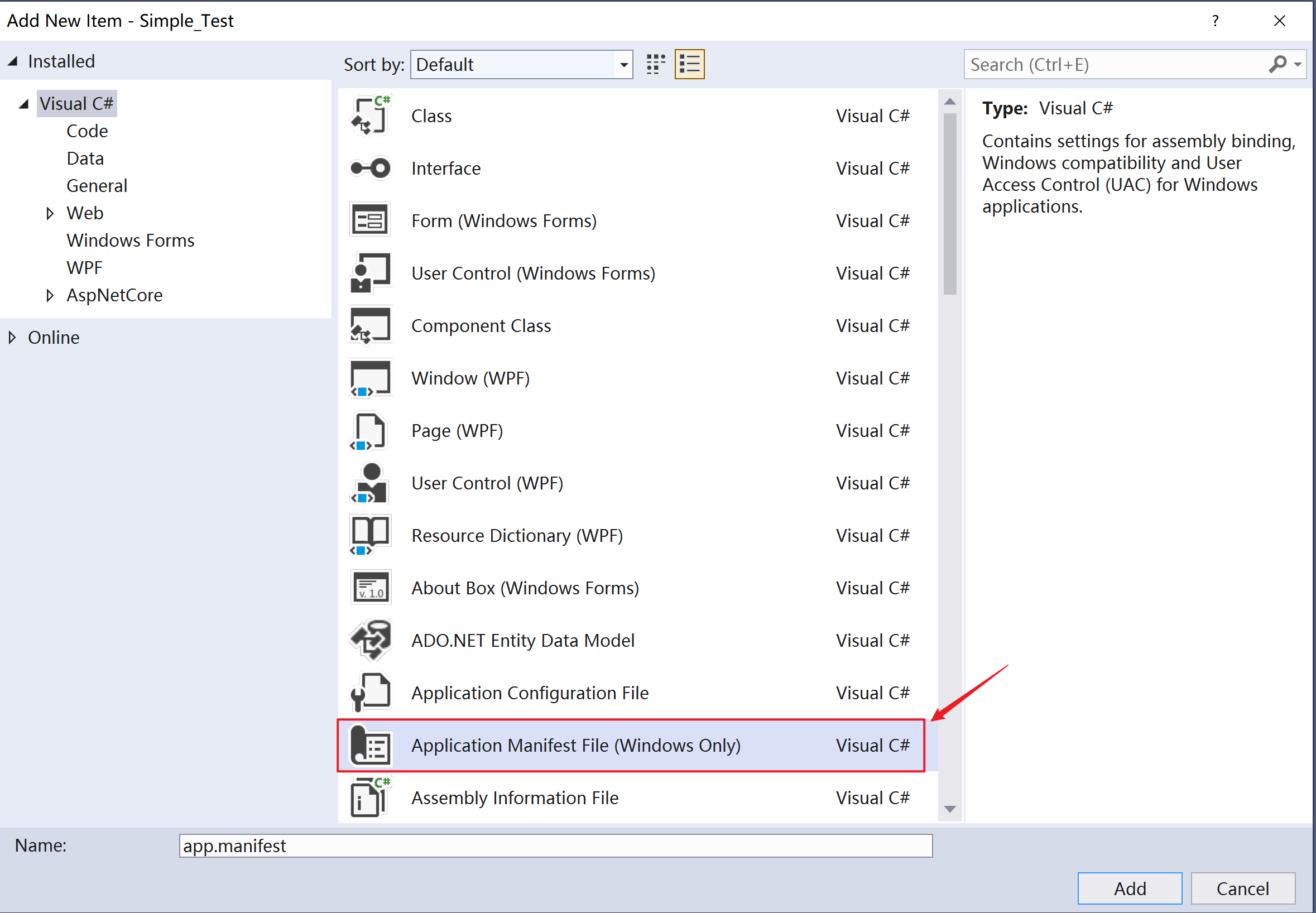 - 首先为对应的 Project 添加 manifest 文件,如下图