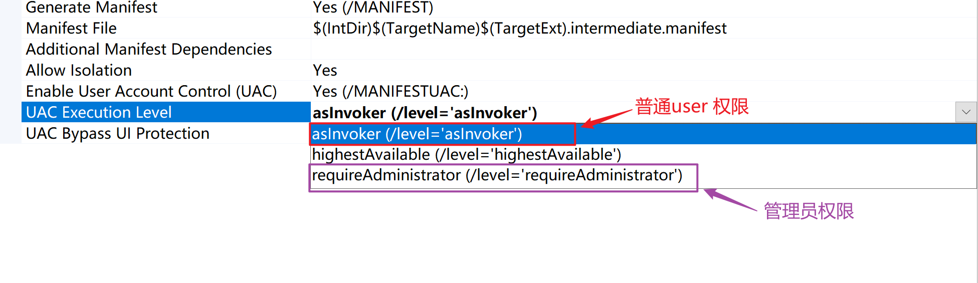 - 进入项目 Properties -> Linker -> Manifest File -> UAC Execution Level 即可设置对应的值,如下图所示: