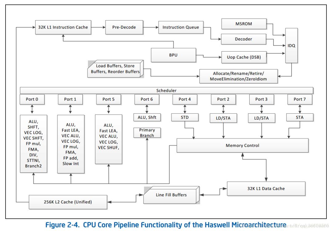 这款CPU拥有8颗处理核心,其他组件有L3缓存和内存控制器等。可以见得该款CPU在物理空间上,“核心”并不是占绝大部分。就单颗Core而言(上图CPU属于Haswell-E架构,下面截图则为Haswell的Core微架构。“Intel processors based on the Haswell-E microarchitecture comprises the same processor cores as described in the Haswell microarchitecture, but provides more advanced uncore and integrated I/O capabilities. ”——《64-ia-32-architectures-optimization-manual》)