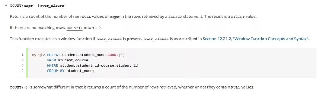 大致意思是:COUNT(expr)返回SELECT语句中expr值不为NULL的行数,返回的结果类型为BIGINT;当没有匹配的行时,返回0;SELECT(*)将返回包括NULL值的行数。