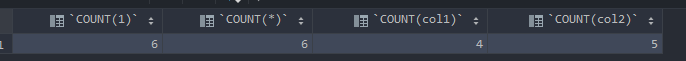 create table count_test(col1 varchar(1),col2 varchar(1)); insert into count_test value ('1','1'); insert into count_test value ('1',null); insert into count_test value (null,'1'); insert into count_test value ('1','1'); insert into count_test value (null,'1'); insert into count_test value ('1','1'); select COUNT(1),COUNT(*),COUNT(col1),COUNT(col2) from count_test;