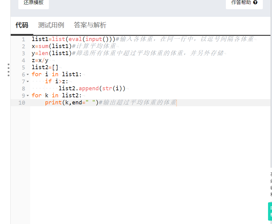 幼儿园体检要对小朋友们的体重做评估,对超出平均体重的小朋友需要提示他们进行锻炼。编程实现:输入若干个体重,输出比平均体重更重的那些体重。输入输出形式见示例说明。