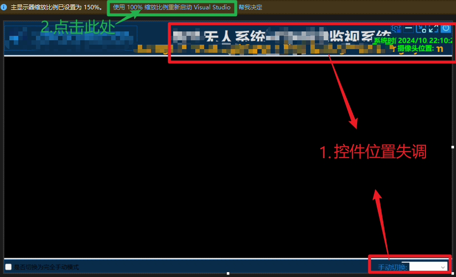 之前在.net framework 4.7.2 开发的winform项目,在visual studio一打开的时候,虽然界面内有些控件也会失调,但是他会提示“使用100%缩放比例重新启动Visual Studio ”