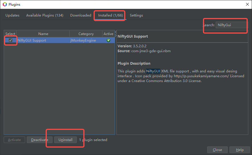 首先打开SDK3.3.x版本(注意这是为3.3.x版本修复的,3.2.x版本使用netbean8之前的版本,与这里不兼容),依次打开Tools->Plugins->Installed,搜索NiftyGui,点击卸载: