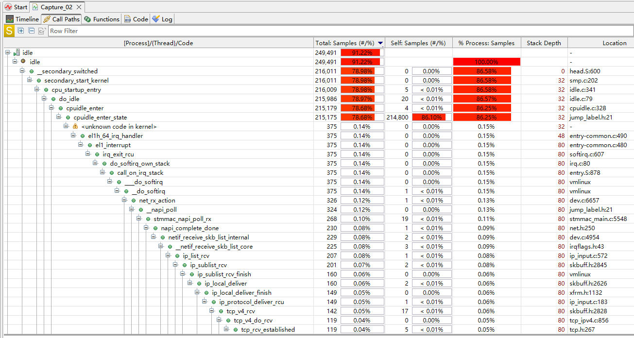 可以标签栏 Timeline,Call Paths,Functions 等查看不同的分析数据,也可以选择指定进程的分析数据。