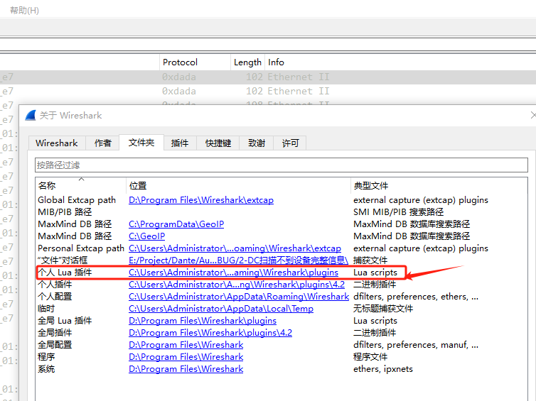 然后把 edsa.lua 放到下图 Wireshark 设定的路径中: