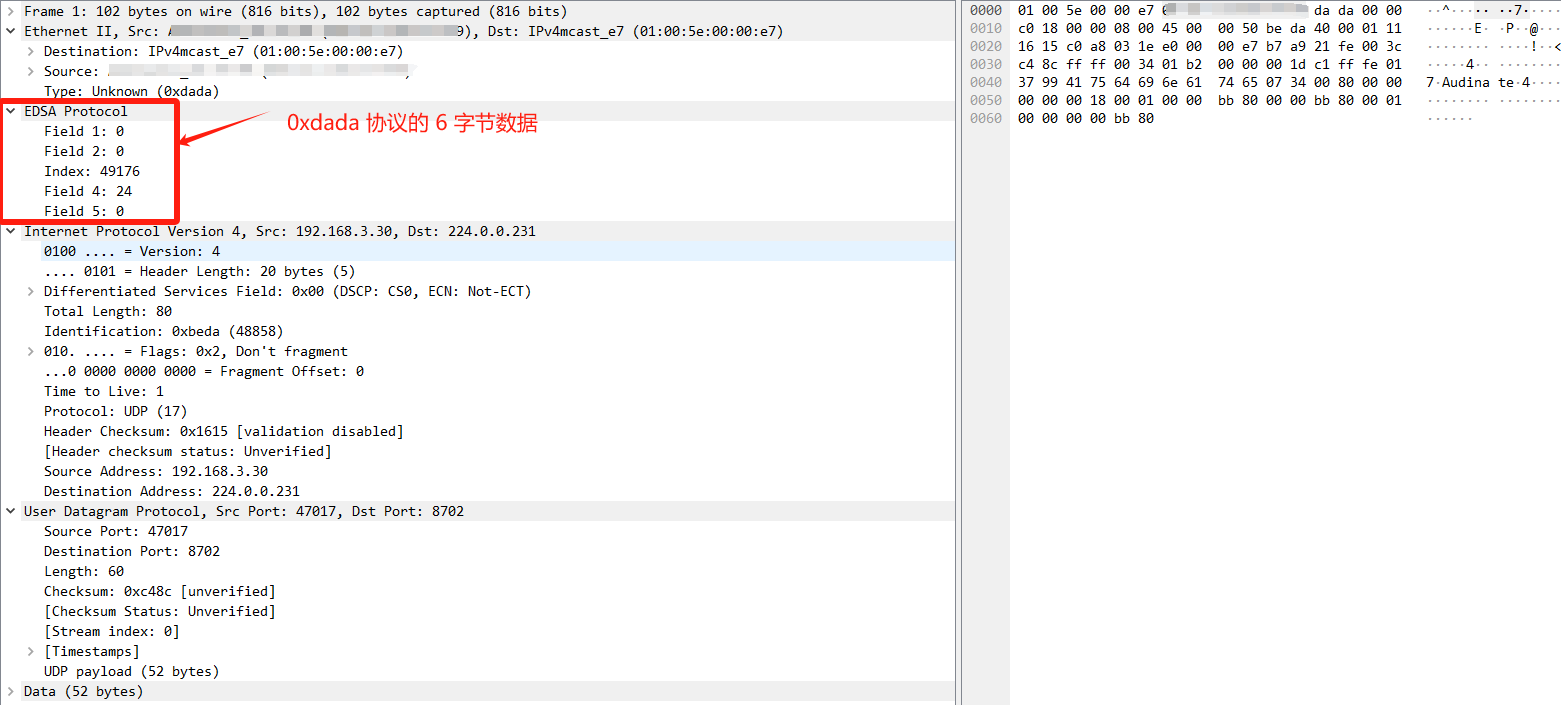 可见 Wireshark 无法正常解析数据帧。接下来编写 Lua 脚本 edsa.lua 如下: