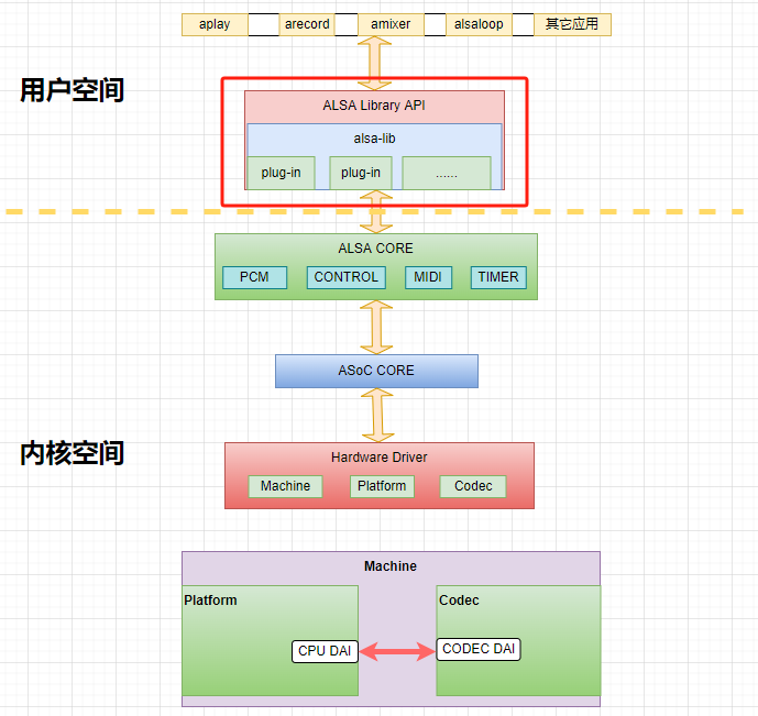 ASoC(ALSA System-on-Chip) 声卡驱动框架如下图所示: