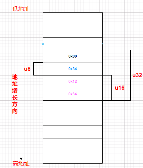 反映出在大端机器上,程序代码的 u16 和 u8 变量读写后内存空间布局如下: