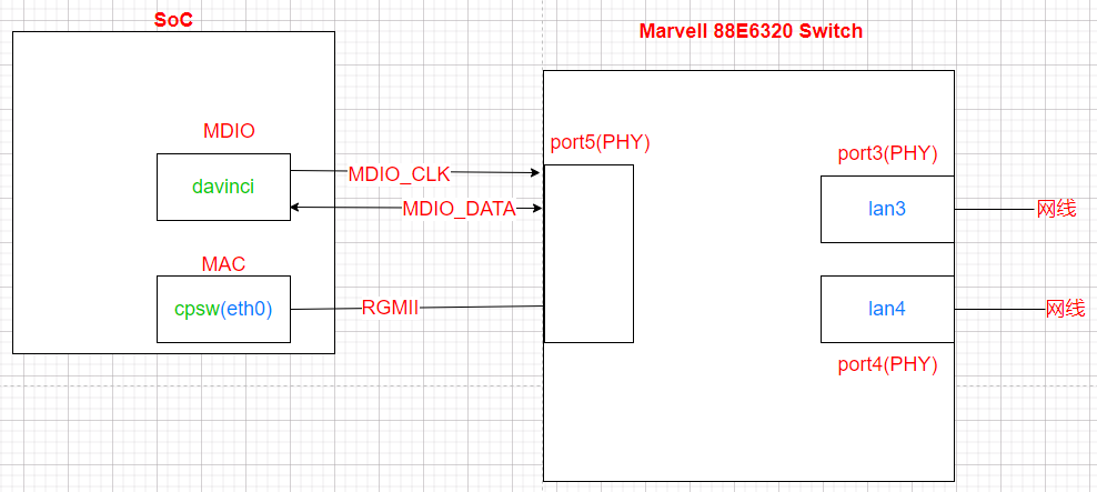 Marvell 88E6320 和 eth0 对应 SoC 的 cpsw MAC 芯片的连接拓扑结构如下: