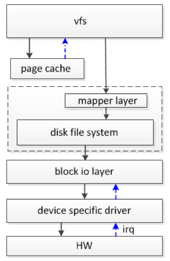 用户发起读写操作时,并不是直接操作存储设备,而是需要经过较长的 IO 栈 才能完成数据的读写。读写操作大体上需依次经过虚拟文件系统 vfs、磁盘文件系统、block 层、设备驱动层,最后到达存储器件,器件处理完成后发送中断通知驱动程序。