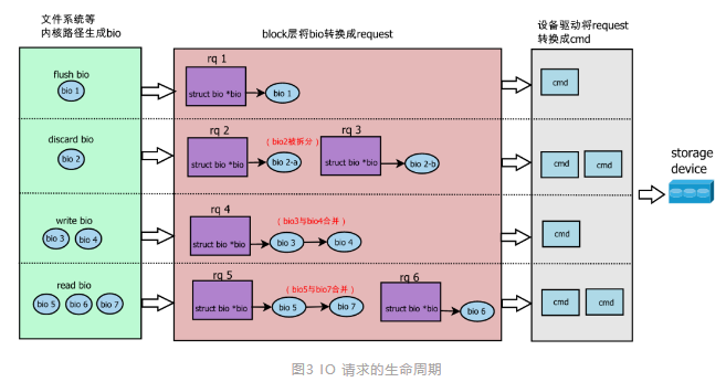 前面提到了 bio,有必要对 bio 做一些简单说明。按照 io 请求的生命周期,io 请求被抽象成了 bio、request(简称 rq)、cmd。bio 由前面提到的 submit_bio() 接口提交。访问存储器件上相邻区域的 bio、request 可能会被合并,称为 bio merge、request merge。若 bio 的长度超过软件或者硬件的限制,bio 会被拆分成多个,称为 bio split。block 层接收到一个 bio 后,这个 bio 将生成一个新的 request,或者合并到已有的 request 中。如下图所示: