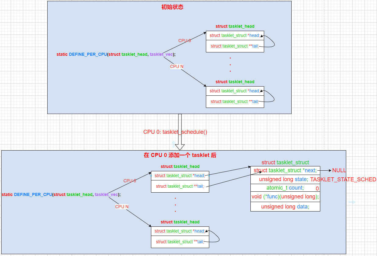 * TASKLET_STATE_SCHED 态的 tasklet 将在 softirq 里面被调度执行.