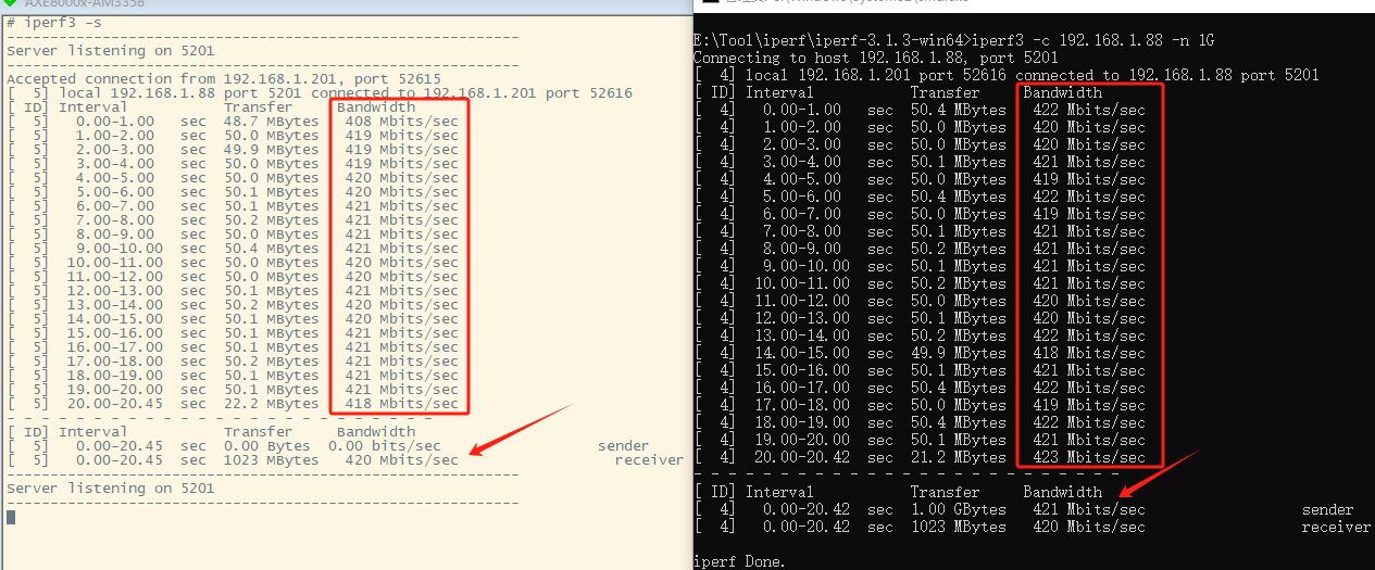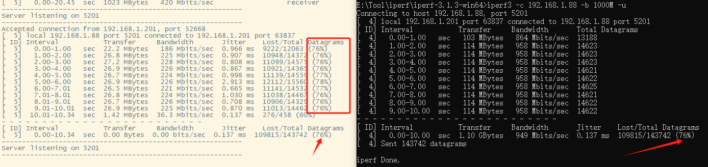 网卡性能的评估,通常会用 iperf 分别测试 TCP 和 UDP 通信的带宽。iperf 是一个 服务端/客户端 模式 的测试工具:一台机器运行 iperf 服务端(通过 -s 参数指定),一台机器运行 iperf 客户端(通过 -c 参数指定)。默认情形下,客户端负责发送数据,服务端负责接收数据,因此此时重点测试的是服务端的 RX 和 客户端的 TX ,虽然各自的另外一个方向也有数据传输,但数据量很小。如果要测试各自另一个传输方向,调换彼此的角色即可:服务端变客户端,客户端变服务端。