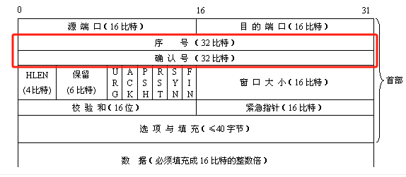 上图是 TCP 协议数据头部,红框中的部分:序号 表示发送端所发送数据的序列号;确认号 表示接收端已收到发送端序号为确认号之前的所有数据,回送确认号告诉发送端,可以继续发送序号从确认号开始的数据。TCP 序列号以一个 32 位无符号数 表示,最大值为 2^32 - 1,到达最大值后回卷到 0 。