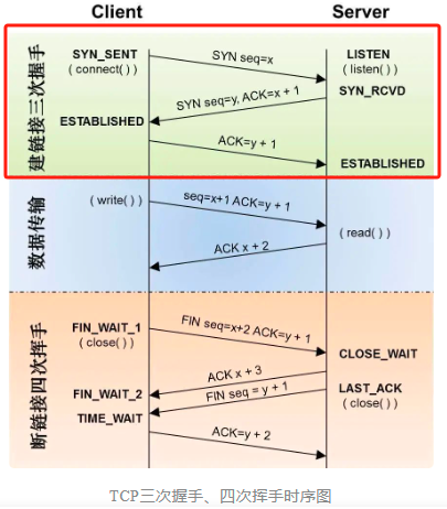 3. 客户端 收到 的 SACK 后,回复 服务端 一个 ACK 包,ACK 包的 TCP 头部中:seq=x+1, ack_req=y+1 。